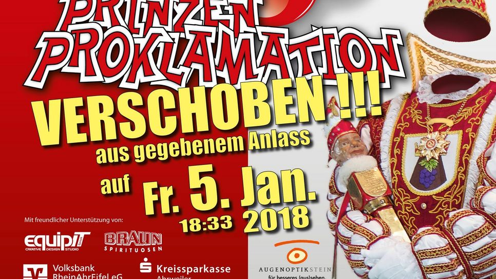 „Et kütt wie et kütt - Es gibt Ereignisse die sich ergeben und keiner braucht und niemand wirklich beeinflussen kann", heißt es in einer Pressemitteilung der KG "Närrische Landskroner" Heimersheim 1950. Nach reiflicher Abwägung habe sich der Vorstand einvernehmlich entschieden, die Proklamation nicht am 11. November durchzuführen, da man es situationsbedingt als unangemessen empfinde. Daher wird die Prinzenproklamation auf Freitag, 5. Januar 2018 verschoben.