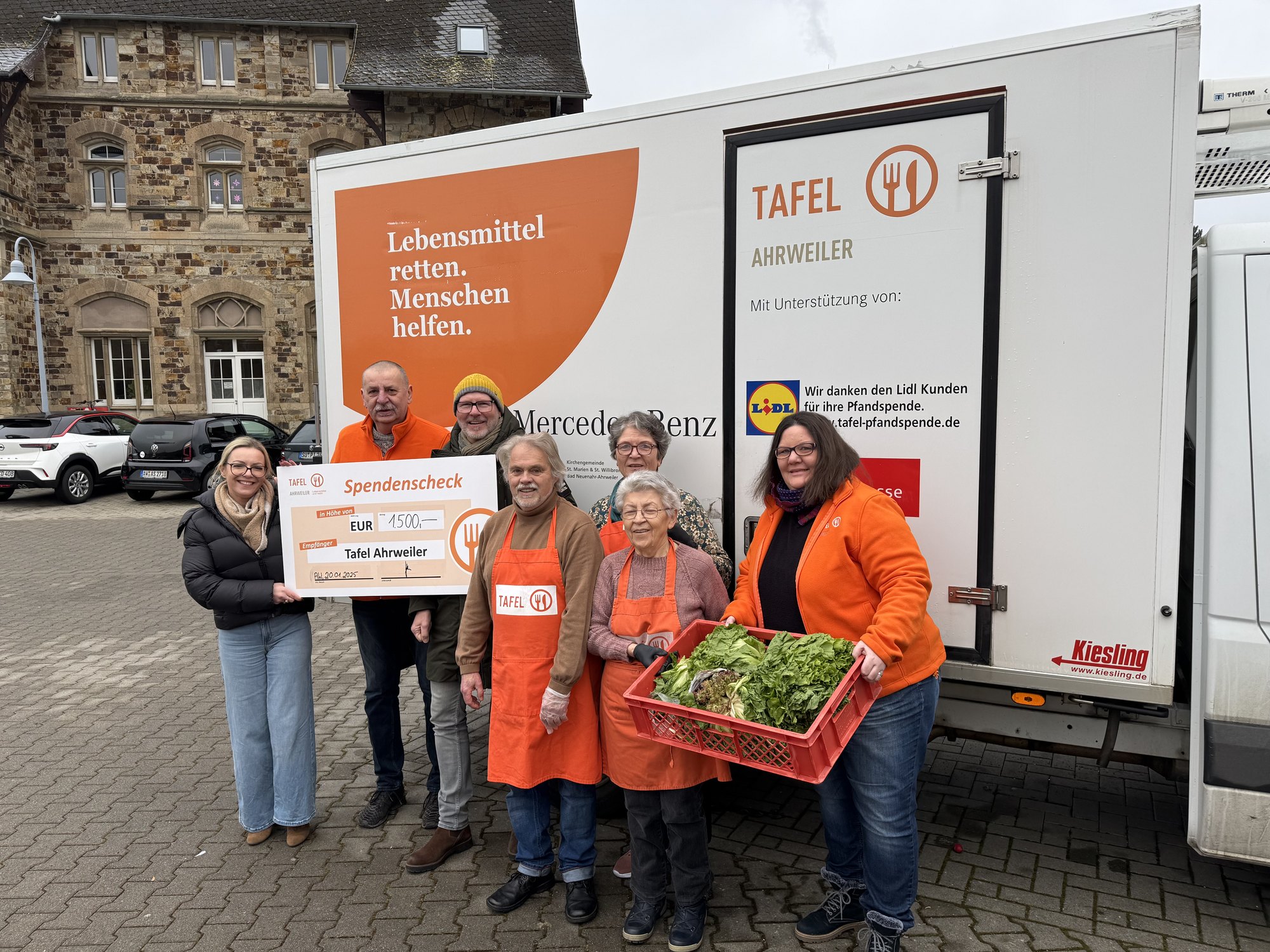 „Wir freuen uns sehr über diese großzügige Spende, die armutsbetroffenen Menschen in der Region an den beiden Ausgabestellen in Ahrweiler und Sinzig zugutekommt. Rund 400 Haushalte sind bei der Tafel Ahrweiler registriert, dies entspricht etwa 1000 Personen“, erläutert Tafel Koordinatorin Mirjam Hagebölling. Jede Spende helfe, die laufenden Kosten zu stemmen, wie beispielsweise den Unterhalt der Tafel-Fahrzeuge und der Kühlgeräte, Miete und Heizkosten sowie Verpackungsmaterialien und andere Dinge im täglichen Tafel-Geschäft. Die Tafel rettet Lebensmittel, die im Wirtschaftskreislauf nicht mehr verwendet werden können und ansonsten in der Tonne landen würden und verteilt diese an armutsbetroffene Menschen.