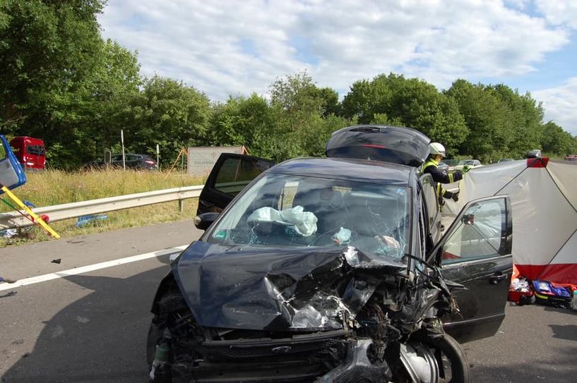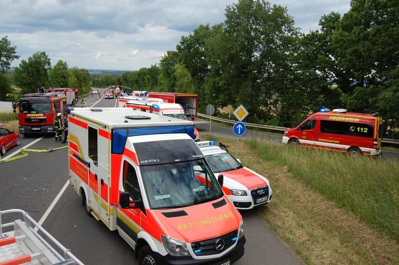 Nach Ermittlungen der Polizei war ein 39-jähriger Mann aus Bonn mit einem Ford S-Max auf der B 257 aus Richtung des Meckenheimer Kreuzes unterwegs. Er geriet in Höhe der Abfahrt zum Gewerbepark Gelsdorf aus bisher ungeklärter Ursache auf die Gegenfahrbahn. Dort kollidierte er mit dem Heckbereich eines entgegenkommenden Campingbusses. Anschließend stieß er mit einem Toyota Kleinwagen zusammen, der hinter dem Campingbus fuhr. Hinter dem Toyota war ein BMW unterwegs. Dieser konnte vor dem Ford zwar auf die Gegenfahrbahn ausweichen, dabei touchierte der BMW allerdings leicht ein Auto das hinter dem Ford aus Richtung Meckenheimer Kreuz kam. Der Fahrer des Campingbusses verlor durch den Zusammenstoß die Kontrolle über sein Fahrzeug. Das Auto überschlug sich und blieb auf dem Dach im Seitenraum liegen. Sowohl der Campingbus, der unfallverursachende Ford als auch der Toyota erlitten Totalschaden. Während der Ford- Fahrer und seine Ehefrau, die auf dem Beifahrersitz saß, sowie die 25-jährige Beifahrerin des Toyotas leicht verletzt wurden, erlitt die Fahrerin des Toyotas schwere Verletzungen. Sie wurde mit dem Rettungshubschrauber in die Uni-Klinik Bonn geflogen. Der Gesamtschaden beläuft sich auf rund 65.000 Euro. Insgesamt waren elf Rettungswagen und Notarztfahrzeuge, ein Rettungshubschrauber, acht Fahrzeuge der Grafschafter Feuerwehr, fünf Funkstreifenwagen, davon zwei aus dem benachbarten NRW, sowie zwei Fahrzeuge der zuständigen Straßenmeisterei eingesetzt. Die Bundesstraße musste für die Rettungs-, Bergungs- und Reinigungsarbeiten für etwa dreieinhalb Stunden voll gesperrt werden.