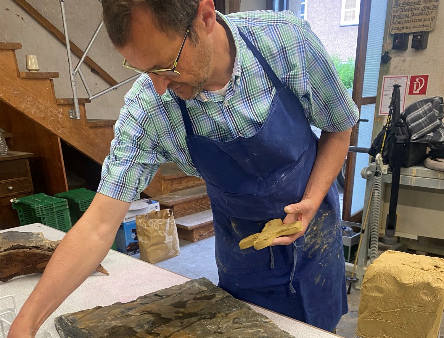Zunächst war geplant, ein Kreuz aus Olivenholz aus Bethlehem in dieses Paket zu stecken. Doch durch eine tolle Begegnung mit Bruder Stephan OSB Maria Laach und Reinhard Sentis ergab sich die Möglichkeit, Keramik Kreuze in Maria Laach herzustellen. Dazu wird Ton aus der Region verwendet werden und diese Kreuze für die Menschen angefertigt werden. "Warum machen wir nicht eine Aktion daraus? Ich biete in meiner Werkstatt auch Kurse an, wo Menschen ihr eigene Gegenstände anfertigen können. Ich könnte auch nach Ahrweiler kommen", so Bruder Stephan OSB. Damit war die Idee für die Aktionstage entflammt. Am vergangen Montag, 16. Mai 2022, fuhren Pfarrer Jörg Meyrer, Andrea Klaus und Nadine Kreuser aus der Pfarrei nach Maria Laach und fertigten zum einen Kreuze an, die schon fertig in die Boxen kommen werden, zum anderen formten Sie gemeinsam mit Bruder Stephan OSB auch Vorlagen für die Aktionstage. Die fertigen Kreuze sind geprägt mit Flutholz und Schiefer aus dem Ahrtal. Zu den Aktionstagen sind alle Menschen im Ahrtal eingeladen, ein eigenes Kreuz für die Wohnung/das Haus herzustellen. Die ersten Aktionstage finden am 19./20. Mai von 15 bis 18 Uhr auf dem Markplatz in Ahrweiler statt. (Bei schlechtem Wetter wird die Veranstaltung in die Zehntscheuer verlegt) Es braucht keine Anmeldung, sondern kommen Sie einfach vorbei! Die weiteren Termine sind der 3. Juni auf dem Pfarrgartenfest von St. Laurentius und der 24. und 25. Juni, jeweils von 15 bis 18 Uhr. Am 24. Juni in Bad Neuenahr-Ahrweiler und am 25. Juni in Heimersheim. Der genaue Ort wird noch bekanntgegeben. Ab dem 24. Juni können auch die Segensboxen abgeholt werden!