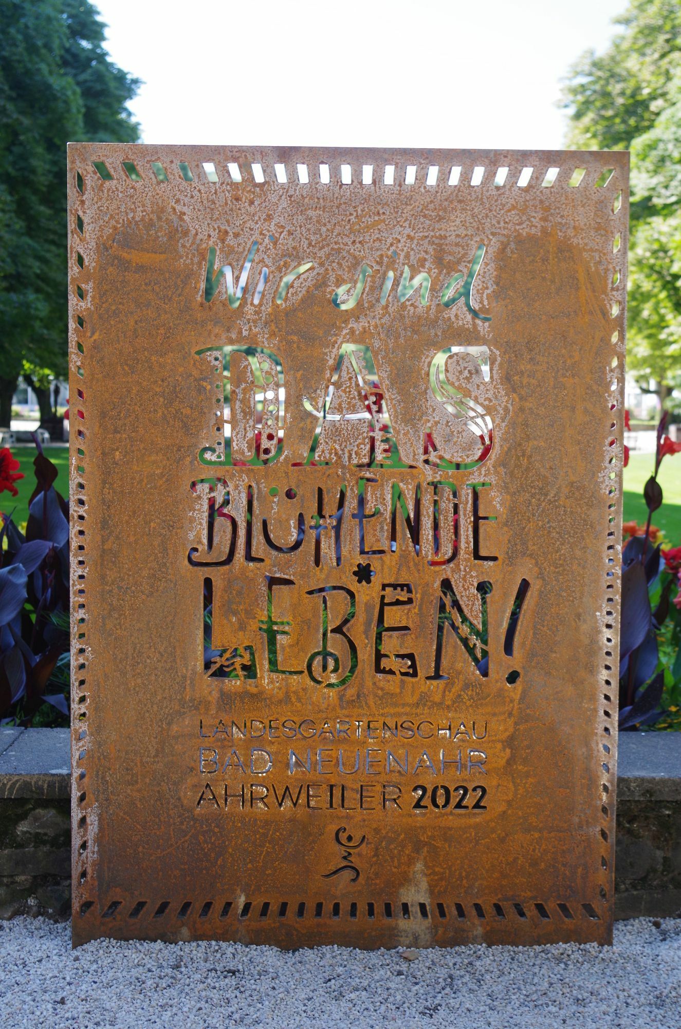 Der rheinland-pfälzische Staatssekretär Andy Becht hat die neue Stele »Das Blühende Leben« im Kurpark von Bad Neuenahr-Ahrweiler besucht. Das Werk aus gewollt rostendem Cortenstahl findet sich an der »Wandelhalle«. Es zeigt das Logo der Landesgartenschau Bad Neuenahr-Ahrweiler 2022 mit dem Spruch »Wir sind das blühende Leben«.