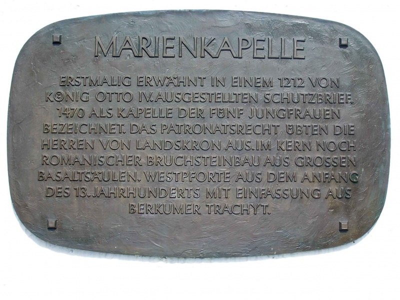 Mit Gewalt haben Diebe in der vergangenen Woche eine Hinweistafel aus der Außenwand der Marienkapelle an der Landskrone bei Heppingen herausgebrochen und gestohlen. Auf der bronzenen Hinweistafel ist die Geschichte der Kapelle beschrieben. Durch das Entfernen der Tafel wurde auch das Mauerwerk beschädigt. Wer Hinweise zur Tat oder den Tätern geben kann, wird gebeten, sich bei der Polizeiinspektion Bad Neuenahr-Ahrweiler unter Tel. 02641-9740 oder pibadneuenahr@polizei.rlp.de zu melden.