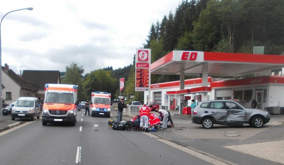 Der 55-jährige Niederländer war von Adenau kommend auf der B 257 in Richtung Altenahr unterwegs, als er in Leimbach beabsichtigte, links auf das Tankstellengelände abzubiegen. Dabei muss er den entgegenkommenden Kradfahrer aus dem Rhein-Sieg-Kreis übersehen haben. Es kam zur seitlichen Kollision, bei der sich der 57-jähriger Yamaha-Pilot lebensgefährliche Verletzungen zuzog. Er verstarb später im Krankenhaus Adenau, während die BMW-Beifahrerin eine Armfraktur erlitt. Sie wurde durch die deformierte Beifahrertür eingeklemmt und musste durch den Einsatz der Rettungsschere der Freiwilligen Feuerwehr Adenau befreit werden. Der Autofahrer blieb nach ersten Feststellungen unverletzt, stand jedoch unter Schock. Beide wurden in der Krankenhaus Bad Neuenahr-Ahrweiler eingeliefert. Die B 257 war für ca. eine Stunde vollgesperrt. Nach weiteren Polizeiangaben wurde eine Sachverständigengutachten zur endgültigen Klärung der Unfallursache in Auftrag gegeben. Die an dem Unfall beteiligten Fahrzeuge wurden sichergestellt.
