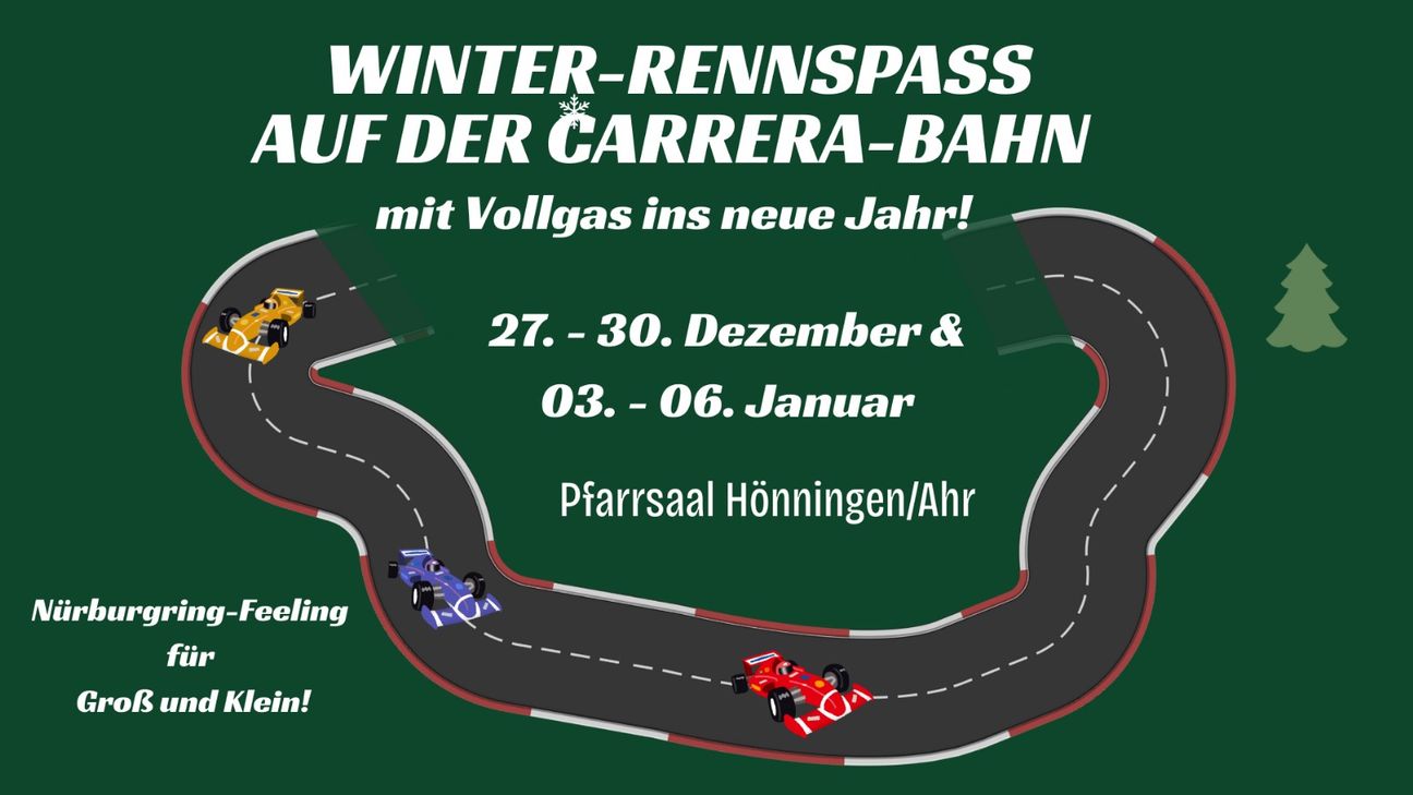 Zwischen den Jahren verwandelt sich der Pfarrsaal Hönningen in eine kleine Rennarena. Vom 27. bis 30. Dezember sowie vom 3. bis 6. Januar können Kinder, Familien und alle Rennbegeisterten täglich von 15 bis 18 Uhr eine große Autorennbahn ausprobieren. Der Unkostenbeitrag beträgt 1,50 Euro pro Person. Aufgebaut ist eine umfangreiche Carrera-Bahn – ideal für spannende Duelle und jede Menge Fahrspaß. Am 30. Dezember ab 18:30 Uhr findet ein Rennabend für Erwachsene statt. Dort treten die Teilnehmerinnen und Teilnehmer in mehreren Läufen gegeneinander an. Der Teilnahmebeitrag liegt bei 10 Euro, inklusive Snacks und Getränken. Eine Anmeldung ist erforderlich (unter www.quartierhoch3.de, per E-Mail an tamara@quartierhoch3.de oder telefonisch unter 0160 91061726) Wer die Veranstaltung unterstützen möchte, kann für 10 Euro eine Werbebande an der Strecke buchen – geeignet für Firmen, Vereine oder Privatpersonen. Die Einnahmen dienen der Deckung der entstehenden Kosten. Die Veranstalter freuen sich auf viele Besucher sowie auf einen schwungvollen Start ins neue Jahr.