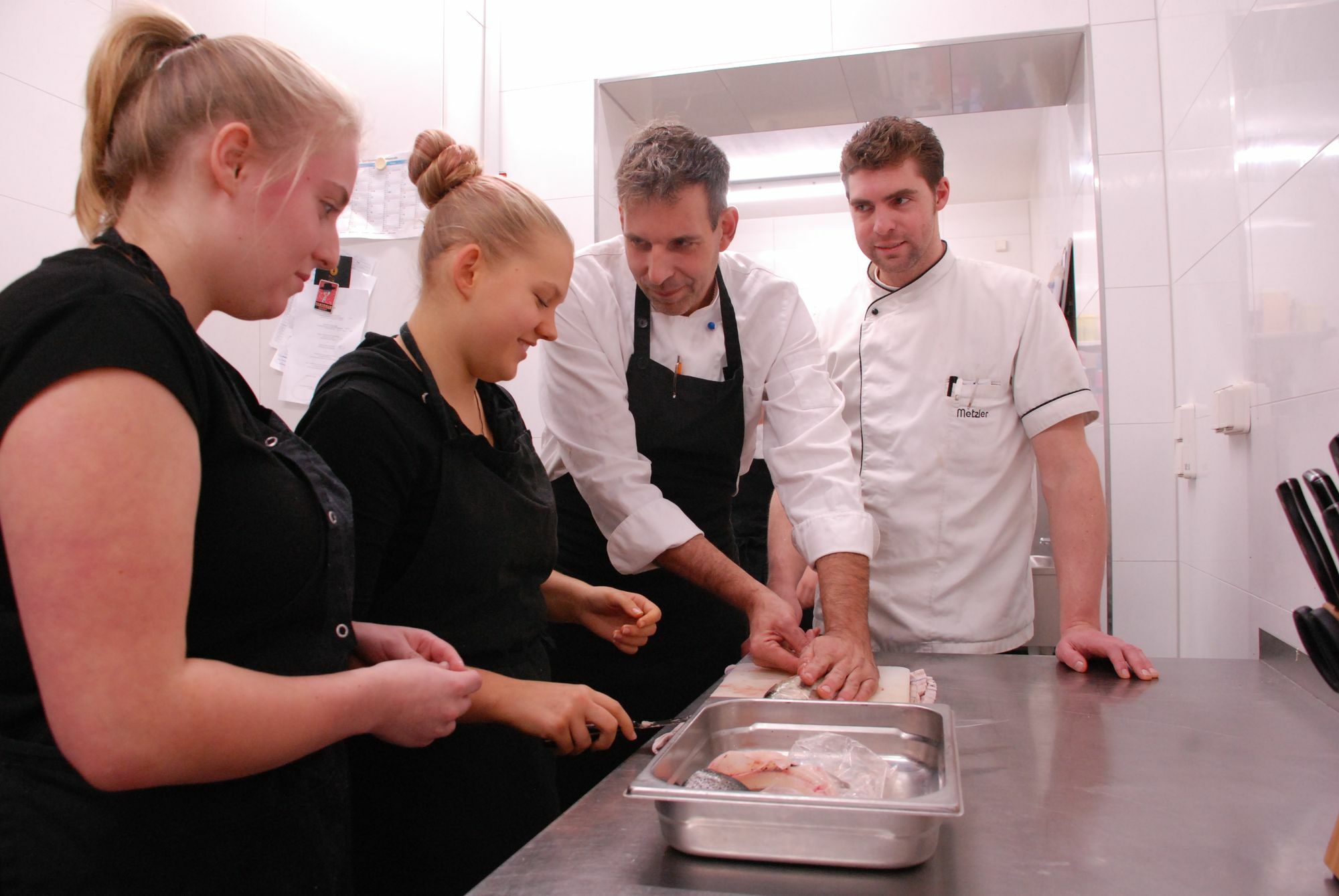 »Es ist mir relativ leicht gefallen, das Menü zu kreiern«, sagte Franziska Schöbel. Die Schülerin experimentiert sowieso gerne in der Küche mit allerlei Gerichten herum. Nicht nur deutsch, so erzählt sie, wird bei ihr gekocht. Auch chinesisches Essen kommt regelmäßig auf den Teller. »Die Inspirationen hole ich mir aus dem Netz oder aus Kochbüchern«, sagt sie. »Ich habe mir vieles angeguckt und dann geschaut, dass die Bruchstücke harmonieren«, so Schöbel. Ihre Koch-Partnerin Alexandra hat vor allem Respekt davor, den Fisch zu kochen. »Es fehlt einfach die Routine«, beruhigt Hauke Metzler. In seiner Küche dürfen die beiden Hobby-Köchinnen unter Aufsicht an ihrem Können feilen. Metzler und sein Team geben Tipps, wie der Fisch am besten zu filetieren ist, wo das Messer angesetzt wird, wo man schneidet.Bis sie das Menü für die Jury kochen müssen, bleiben noch ein paar Tage Zeit.