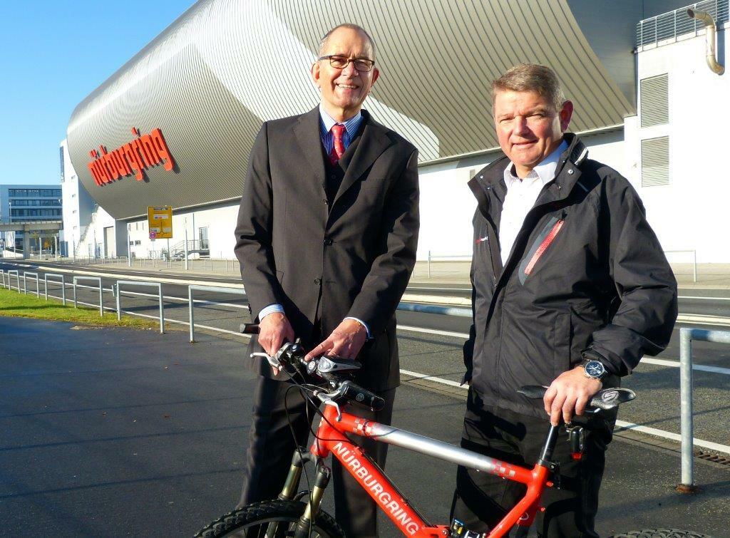 Hanns-Martin Fraas, Geschäftsführer der Eventwerkstatt, und Carsten Schumacher, Geschäftsführer der capricorn Nürburgring GmbH, haben jetzt einen längerfristigen Vertrag abgeschlossen, der bis 2018 läuft und eine Option für zwei weitere Jahre beinhaltet. »Dieser längerfristige Vertrag gibt uns endlich Planungssicherheit und eröffnet neue Perspektiven, um ‚Rad am Ring‘ über die nächsten Jahre zielstrebig ausbauen zu können«, sagt Fraas, der mit seiner Eventwerkstatt und Mitveranstalter Rad-Club Herschbroich diesen populären Radsport-Event organisiert. Schumacher spricht von einer sicheren Grundlage für die kommenden Jahre, die man der erfolgreichen Veranstaltung mit dem neuen Vertrag gebe. Vor allem das 24-Stunden-Rennen der Rennradfahrer als Hauptwettbewerb bei »Rad am Ring« gilt als weltweit einzigartig. Einzelfahrer und Teams mit zwei, vier oder acht Fahrern kämpfen über Tag und Nacht gegen die Strapazen der anspruchsvollen Kombination aus Grand-Prix-Kurs und Nordschleife, bekannt und gefürchtet als »Grüne Hölle«. Auf einem Kurs rund um die Nürburg tragen auch Mountainbike-Fahrer ein 24h-Rennen aus. Darüber hinaus gehören Jedermann-Rennen über 25, 75 und 150 Kilometer ebenso zum vielfältigen Wettbewerbs-Angebot bei »Rad am Ring« wie Zeitfahren, Tourenfahrten und eBike-Rennen.