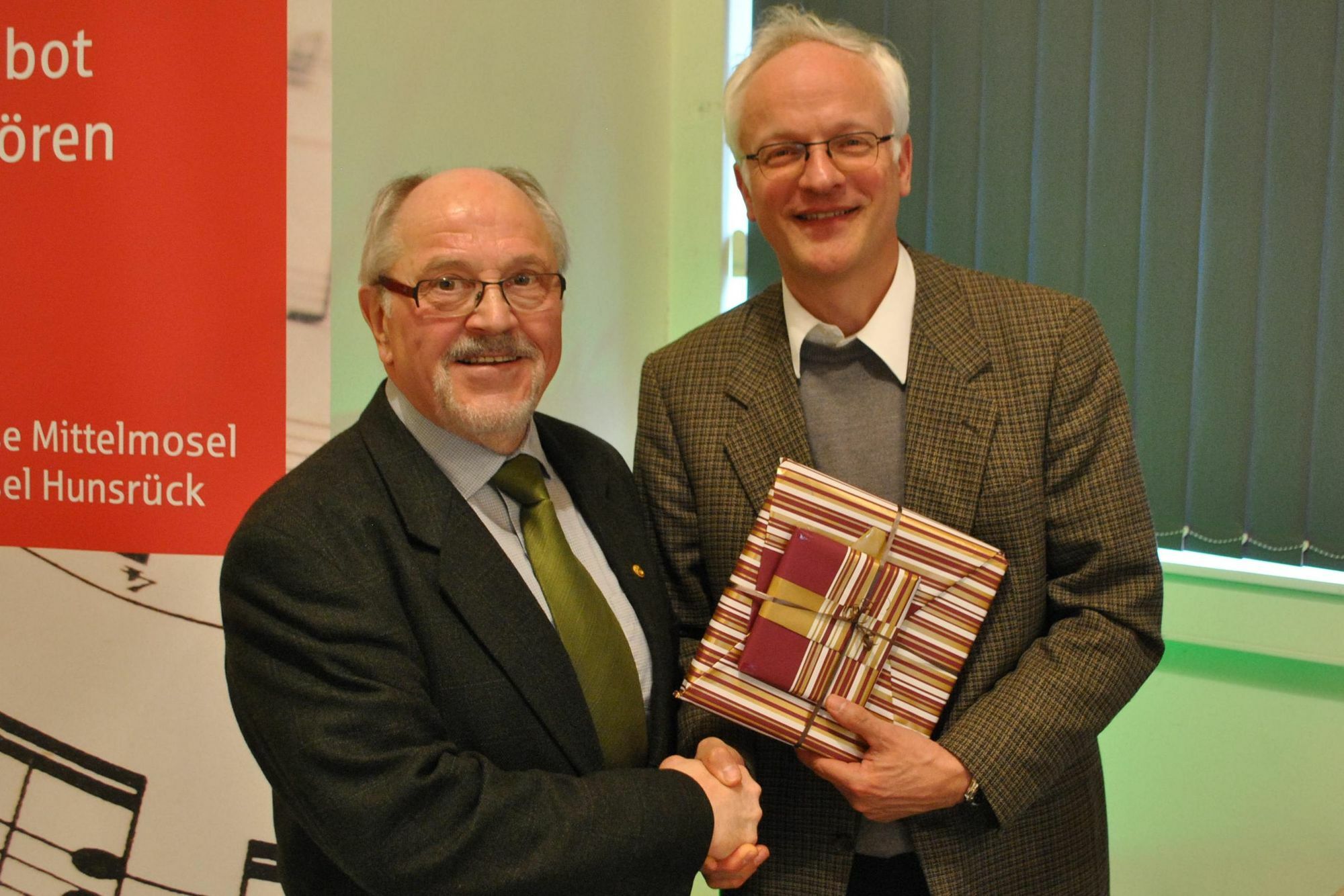 Bereits seit 1989 ist Josef Thiesen als Kreis-Chorleiter für den Kreis-Chorverband tätig. Heribert Kappes nutzte als Kreis-Vorsitzender das Forum des Chorverbandstages um ihm für dieses langjährige Engagement zu danken. Als Kreis-Chorleiter habe er sich auf vielfache Weise intensiv und mit großer fachlicher Kompetenz für das Chorsingen eingesetzt. Neben der Organisation von vielen Kreis-Chorkonzerten waren es Fortbildungsveranstaltungen und Workshops. In lebhafter Erinnerung sind die besonderen Highlights, wie die Aufführung des Oratoriums „Elias“, das Konzert „1000 Jahre Chormusik“, die Großveranstaltungen „Nacht der 1000 Stimmen“, „Vocal plus“ und zuletzt das „Generationenübergreifende Singen“. Der Chorverband Rheinland-Pfalz hat Josef Thiesen bereits vor einigen Jahren mit der Ehrennadel für besondere Verdienste ausgezeichnet. Im vergangenen Jahr wurde er zudem zum Regional-Chorleiter gewählt. Als Anerkennung und Dank für seine nun bereits 27 Jahre andauernde Tätigkeit als ehrenamtlicher Kreis-Chorleiter konnte Thiesen ein kleines Präsent entgegen nehmen. Die Delegierten der Mitgliedsvereine bestätigten ihn für weitere drei Jahre im Amt. Leo Raskob hat nach 12jähriger Vorstandstätigkeit, unter anderem als stellv. Vorsitzender für die Region Eifel und zuletzt als Geschäftsführer, auf eine erneute Kandidatur verzichtet. Der Kreis-Vorsitzende dankte ihm für seine zeitintensive Arbeit als Kontaktperson für die Mitgliedsvereine. Da bei den Vorstandswahlen kein Nachfolger gefunden werden konnte, erklärte Leo Raskob sich bereit, das Amt des Geschäftsführers für die Dauer eines Jahres kommissarisch auszuüben. Foto: KCV