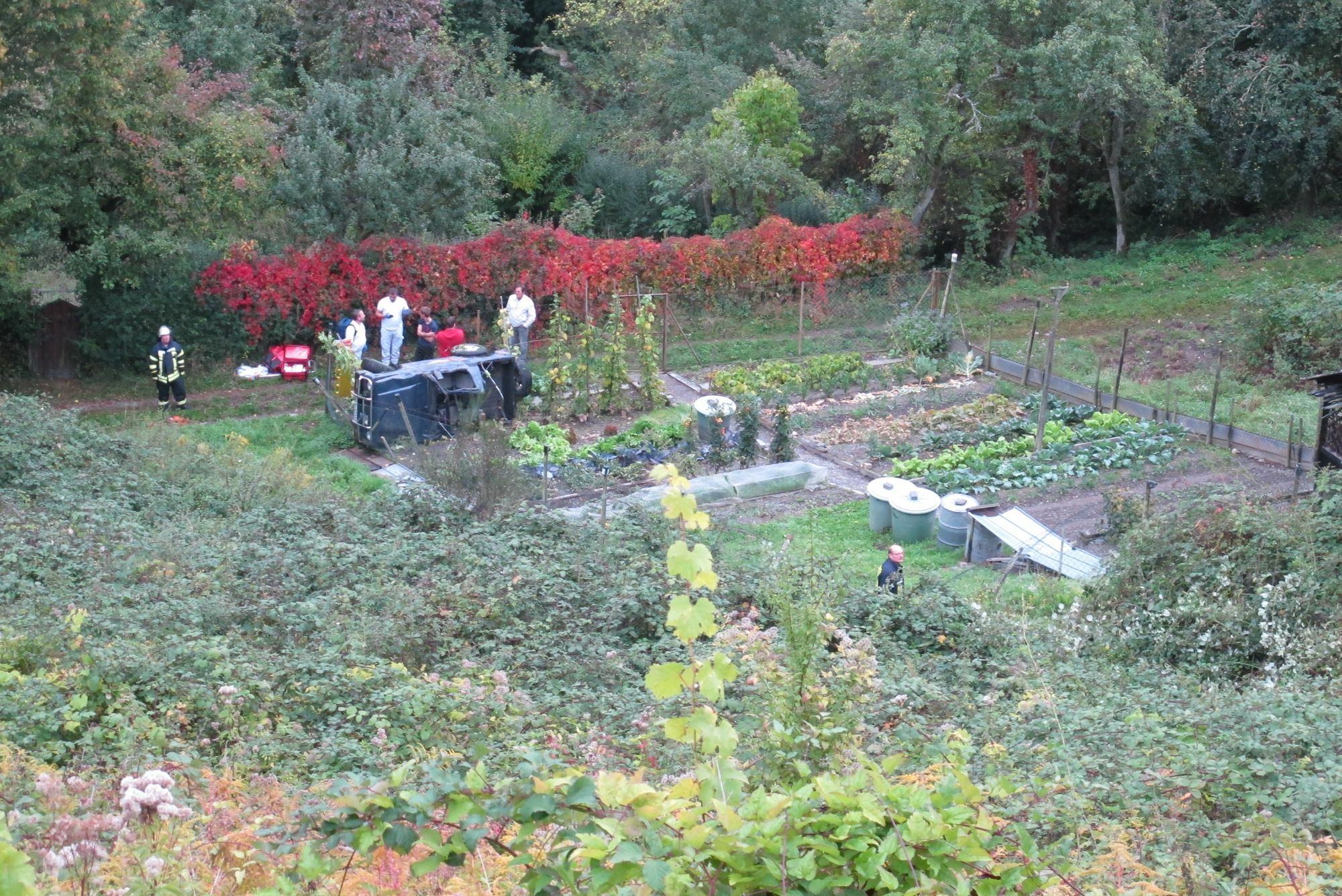 Ein schwer- und zwei leicht verletzte junge Männer forderte heute Mittag ein Unfall in steilem Gelände im Distrikt „Taubenhaus“ in der Nähe des Traben-Trarbacher Gymnasiums. Der 20-jährige Jeep-Fahrer aus der Region hatte sich vermutlich verfahren und war auf einem nicht mehr genutzten, bereits mit Sträuchern zugewachsenen, unbefestigten Weg in eine Senke geraten und umgekippt. Dabei stürzte der Wagen über den seitlichen Wegrand ab und rollte etwa 100 Meter durch steiles Buschgelände den Abhang hinunter bis zu einem flacheren Gartengrundstück, auf dem das Fahrzeug total beschädigt liegenblieb. Alle drei Insassen waren gleich zu Beginn vom Fahrzeug geschleudert worden, wobei der 20-Jähriger Beifahrer aus dem Raum Wittlich unter und von dem sich überschlagenden Jeep getroffen und schwer verletzt wurde. Er musste mit dem Rettungshubschrauber in eine Trierer Klinik abtransportiert werden. Der Fahrer und ein weiterer 20-jähriger Mitfahrer aus Neuss kamen mit leichteren Verletzungen glimpflich davon. Foto: Polizei