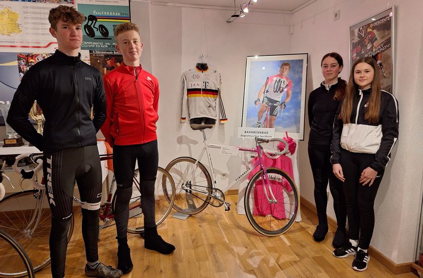 Am Kloster Machern dann eine Pause, um die Ausstellung anzusehen, die im Wochenspiegel angekündigt war. Überraschung: Tatsächlich sind hier Schätze zusammengetragen, die jedes Radfahrerherz höherschlagen lassen. In mehreren Räumen stehen hochglanzpolierte Rennmaschinen aus sechs Jahrzehnten, dazu illustrierende Fotos mit Rennszenen und Tourhelden wie Jan Ullrich sowie Vitrinen voller Sammler-Schätze wie genieteten Ledersättel oder historischen Trikots.