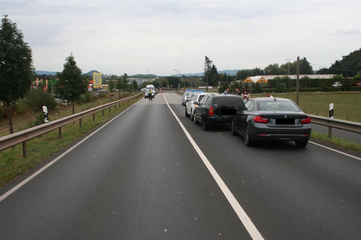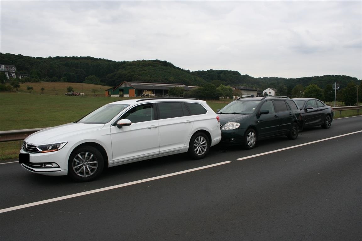 Am Montag, 19. September, kam es gegen 16 Uhr auf der L 141, zwischen Hof Breit und dem Verkehrskreisel am Globus-Baumarkt, zu einem Auffahrunfall zwischen drei Pkws. Mitten im Berufsverkehr gab es das Übliche Stop and Go.Zwei hinter einem VW-Passat fahrende Verkehrsteilnehmer fuhren vermutlich ungebremst auf ihn auf. Durch den Zusammenstoß wurden die drei Fahrer und ein Beifahrer leicht verletzt. Bei der Unfallaufnahme stellten die beamten zudem fest, dass der moldawische Führerschein eines Unfallbeteiligten in Deutschland keine Gültigkeit mehr ausweist. Es entstand Sachschaden von etwa 23.000 Euro. Zwei Fahrzeuge waren nicht mehr fahrbereit und mussten durch Abschleppdienste abtransportiert werden. Die Unfallstelle war für etwa eine Stunde nur einseitig befahrbar, so dass der Verkehr stoppte und eine polizeiliche Verkehrsregelung erforderlich war. Zeugenhinweise erbittet die Polizei in Wittlich unter Tel. 06571 / 92 60. Fotos: Polizei