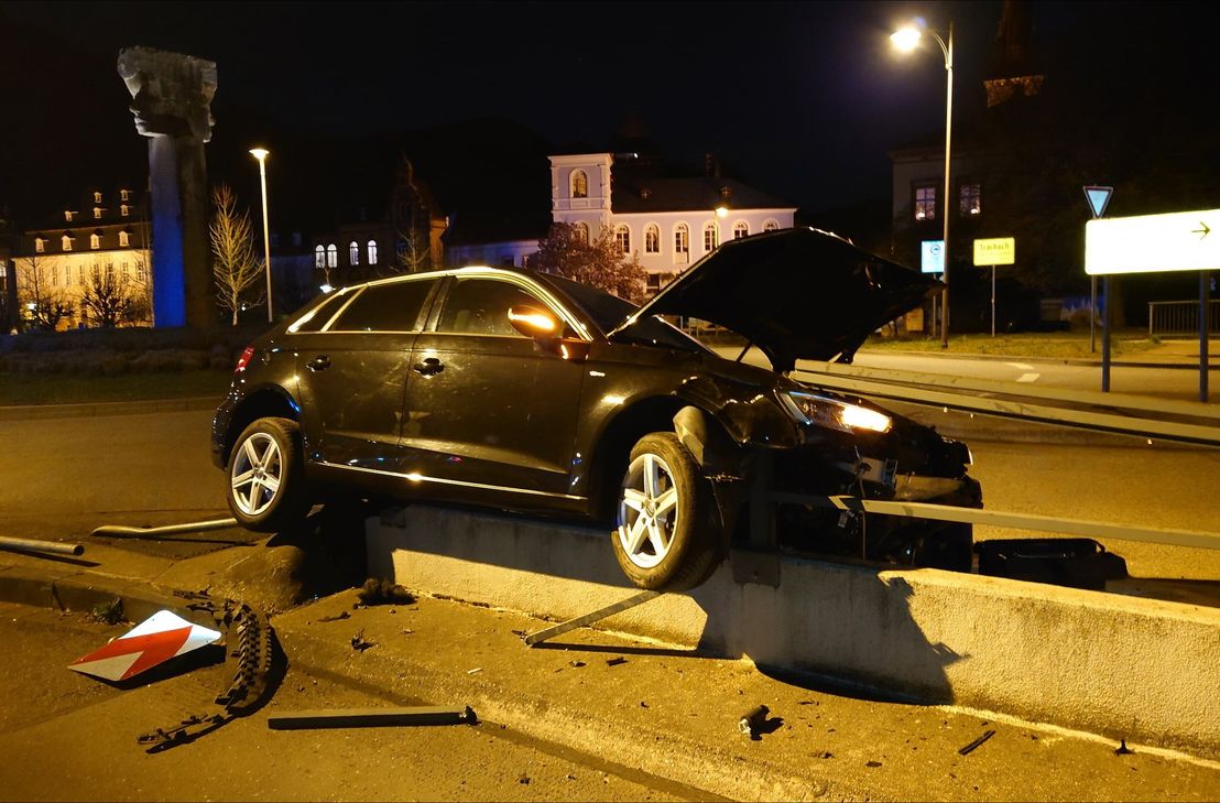 Ein Pkw befuhr den Kreisverkehrsplatz und verlor beim Verlassen der Ausfahrt in Richtung Wolf aufgrund überhöhter Geschwindigkeit und offenbar mangelnder Aufmerksamkeit die Kontrolle. Das Fahrzeug kam von der Fahrbahn ab, überfuhr mehrere Verkehrszeichen und krachte schließlich auf eine Mauer, die zu einer kleinen Brücke gehört. Dabei wurde das auf der Mauer befestigte Brückengeländer vollständig herausgerissen.