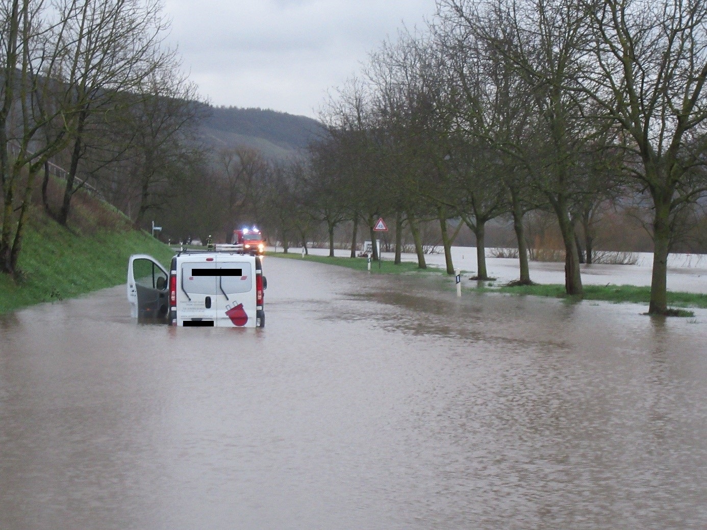 Aufgrund falscher Einschätzung der Wasserhöhe blieb das Fahrzeug im Moselhochwasser liegen und musste durch die Feuerwehr geborgen werden.