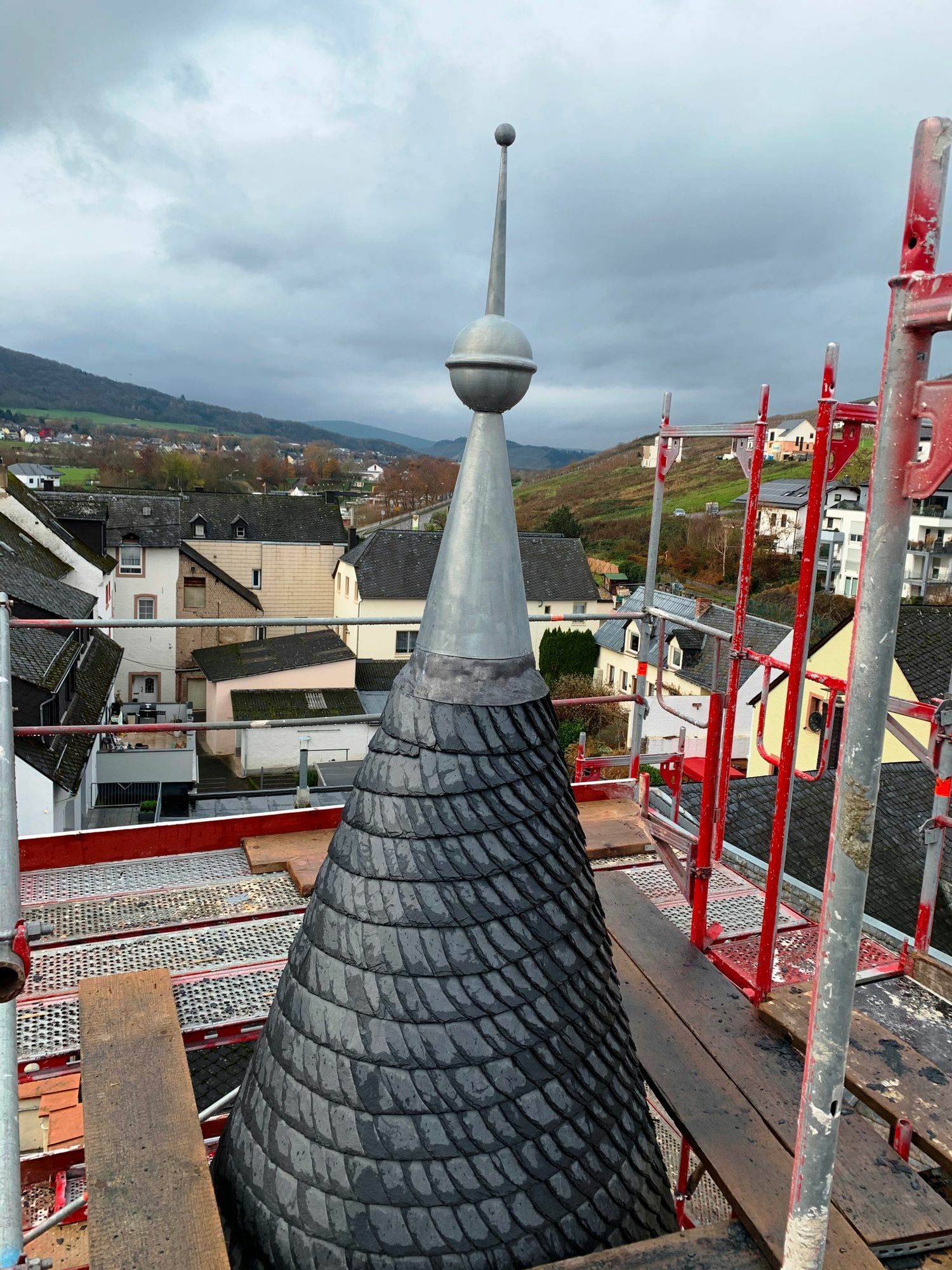 Der zuletzt 1922 erneuerte Turm ist komplett mit einer alt-deutschen Schiefereindeckung ausgestattet worden. Laut Dachdeckermeister Laurin Oster gehört dies zu den Königsdisziplinen im Dachdeckerhandwerk. Eine Spezialarbeit, die nur noch wenige Dachdeckerbetriebe beherrschen. Nach der Sanierung des Außenputzes, muss am Turm nur noch die Fassade gestrichen werden. "Sollten die Temperaturen es zulassen, könnte das Außengerüst noch vor Weihnachten wieder abgebaut werden", so der Wunsch der begleitenden Architektin Sabine Basten von Berdi Architekten. Im Innenbereich sind die Arbeiten ebenfalls bis zu 80% fertig gestellt. Probleme bereitet der Stadt derzeit die Aufzugsfirma. Mit einem Aufzug wird das Geburtshaus zukünftig barrierefrei erschlossen. Doch noch ist die Anlage trotz frühzeitiger Beauftragung nicht geliefert worden. "Hier hängen wir im Bauzeitenplan etwas hinterher, da sich mit der verspäteten Lieferung auch die Installation des Aufzuges verzögert", kritisiert Stadtbürgermeister Wolfgang Port. Das Cusanus Geburtshaus soll nach der Renovierung weiterhin als Museum, aber auch als Seniorenakademie genutzt werden. Die Verantwortlichen hoffen das Haus Anfang März der Öffentlichkeit wieder zur Verfügung stellen zu können. (red)
