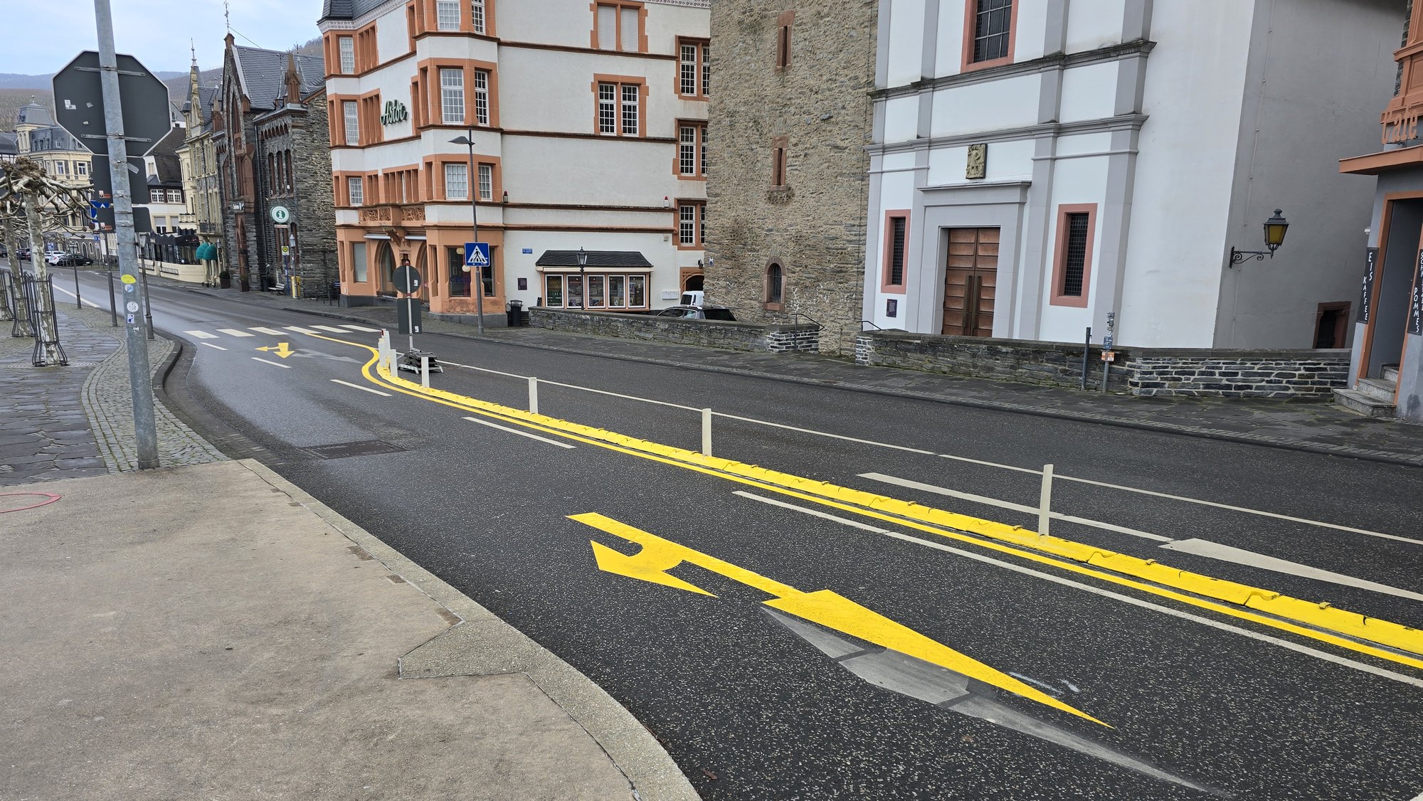 Mit den neuen gelben Markierungen auf der Fahrbahn werden die veränderten Verkehrsführungen sichtbar gemacht. Gleichzeitig wird die Durchfahrt von Tiefenbach sowie die Ausfahrt vom Parkplatz zur Grabenstraße für die Dauer der Probephase gesperrt. Diese Regelung soll später auch endgültig in Kraft treten, um die Verkehrsführung weiter zu optimieren.