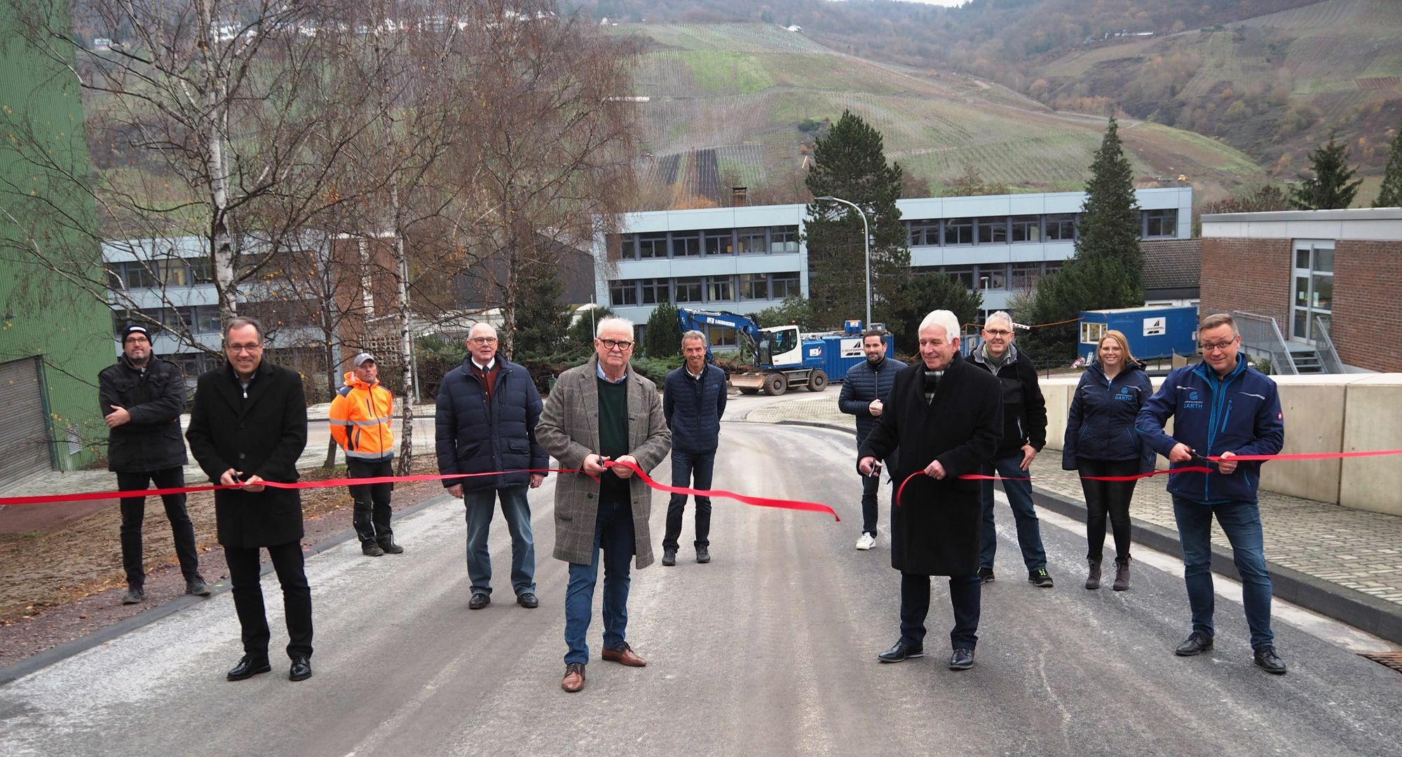 Landrat Gregor Eibes, Stadtbürgermeister Wolfgang Port, Verbandsbürgermeister Leo Wächter und Christian Heck vom Ingenieurbüro Garth (vordere Reihe von links) haben das Band zur Freigabe durchgeschnitten. Vertreter der ausführenden Baufirma und der ortsansässigen Schulen sind ebenfalls mit dabei gewesen. Für Landrat Eibes ist dieser Streckenabschnitt einer der wichtigsten Maßnahmen gewesen, um vor allem das verkehrstechnische Miteinander der Betriebe mit den Schulen gut zu regeln. Auch Verbandsbürgermeister Leo Wächter sieht in der neuen Streckenführung Vorteile für den Verkehrsfluss. Die 90 neu geschaffenen Parkplätze können über den neuen Abschnitt an- und abgefahren werden. "Der Schülerverkehr ist somit auch erstmal aus den weiteren Bauabschnitten raus", erklärt Stadtbürgermeister Port. Der LKW Verkehr wird während der nächsten Bauabschnitte weiterhin noch oben durchfahren. Laut Ingenieurbüro Garth liegen die Arbeiten etwas im Zeitplan zurück. Von Seiten der Vebandsgemeinde-Werke werden auch die Wasser- und Abwasserleitungen für knapp 900.000 Euro erneuert. Voraussichtliche Fertigstellung der gesamten Maßnahme soll im Spätsommer 2021 sein. (red)