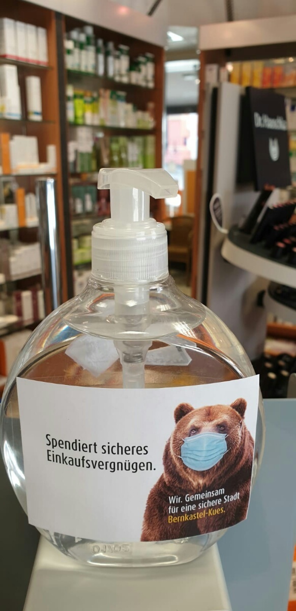 Was dauerhaft vorerst alle begleiten wird, sind die Hygienemaßnahmen und Abstandsregelungen. Hierzu haben der Werbekreis, die Entwicklungsagentur und die Stadt Bernkastel-Kues ein Hygienemaßnahmenpaket für den Einzelhandel geschnürt. Desinfektionsmittel im Spender, Spuckschutzmasken und Hinweisschilder sind kostenfrei in die Betriebe verteilt worden. Ein gedruckter Bär mit Spuckschutzmaske taucht immer wieder auf den Hygieneartikeln auf.