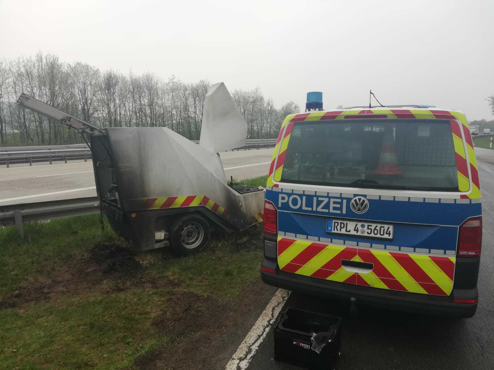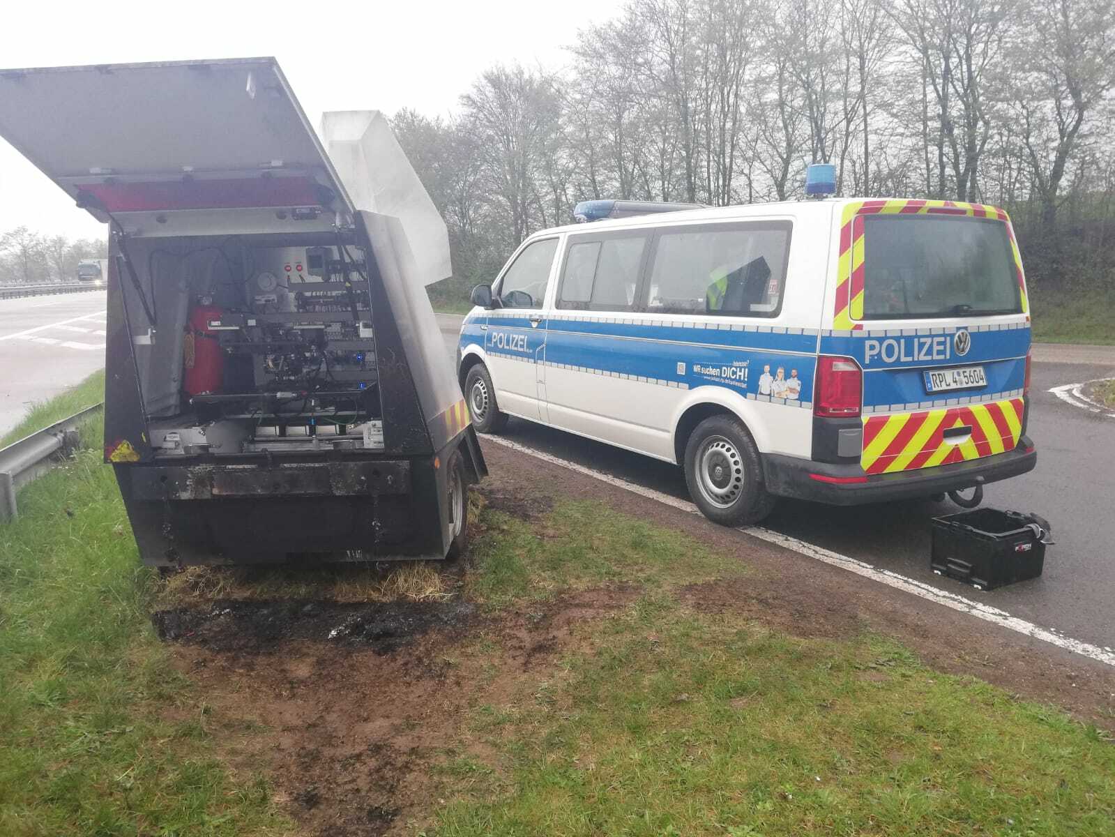 Am Mittwochmorgen, 10. April, vermutlich gegen 3 Uhr, wurde auf der A 1, Rastanlage Pohlbach, Gemarkung Sehlem/Salmtal, ein Blitzeranhänger durch unbekannte Täter in Brand gesetzt.