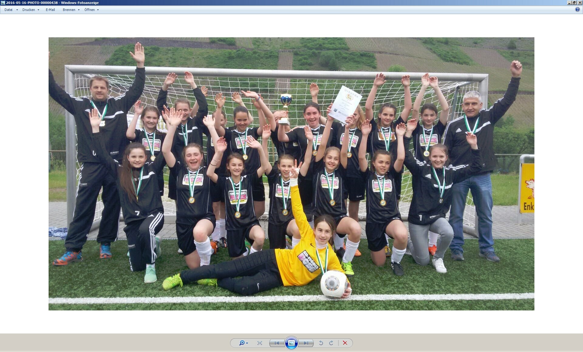 Nach dem Erfolg im letzten Jahr bei den D-Juniorinnen, fiel die Entscheidung dieses Jahr erst in einem spannenden Finale per Elfmeterschießen. An dieser Stelle bedankt sich das Team auch nochmals recht herzlich beim Ausstattungssponsor "Haushaltswaren & Werkzeuge Lautwein" aus Bitburg. vordere Reihe von links : Celine Zwilling, Julia Falkenberg, Kim Schneider, Vivien Weber, Meike Schnur, Lena Hubert, Alica Clemens, Sophie Sowart hintere Reihe von links : Uwe Zwilling, Samira Schmitt, Julia Sowart, Hannah Latz, Sarah Weber, Lina Möhnen, Jessika Szczybylo, Anna Lena Meyer, Joanna Scholz, Vanessa Reger, Ralf Hubert