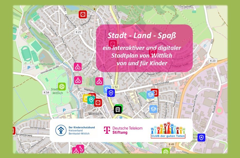 Der digitale Stadtplan bietet zahlreiche Funktionen: Er zeigt Schulen, Spielplätze, Kinderärzte sowie zentrale und besondere Orte in Wittlich. Die interaktive Plattform ermöglicht eine freie Sortierung und Darstellung der Inhalte – und das Beste: Der Stadtplan wächst stetig weiter! Kinder und Jugendliche können neue Orte ergänzen und so aktiv an der Gestaltung mitwirken.