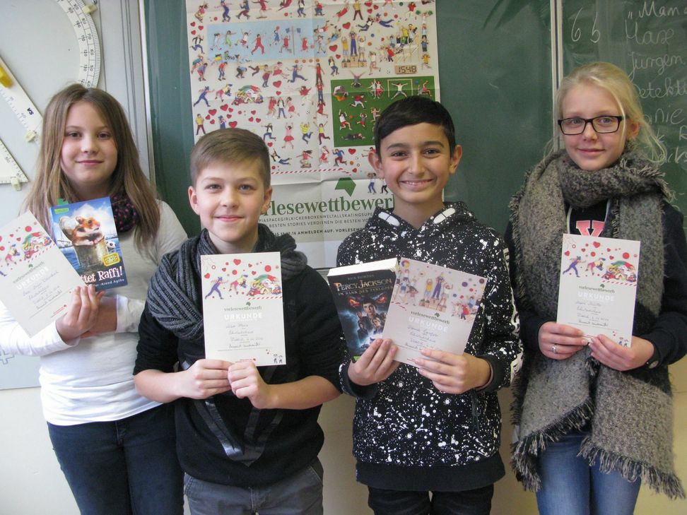 Auf dem Bild von links: Lena-Louise Weberskirch, Max Heinz, Daniele Garofalo und Marie Müller freuen sich über ihre Urkunden als Klassensieger. Foto: Schule