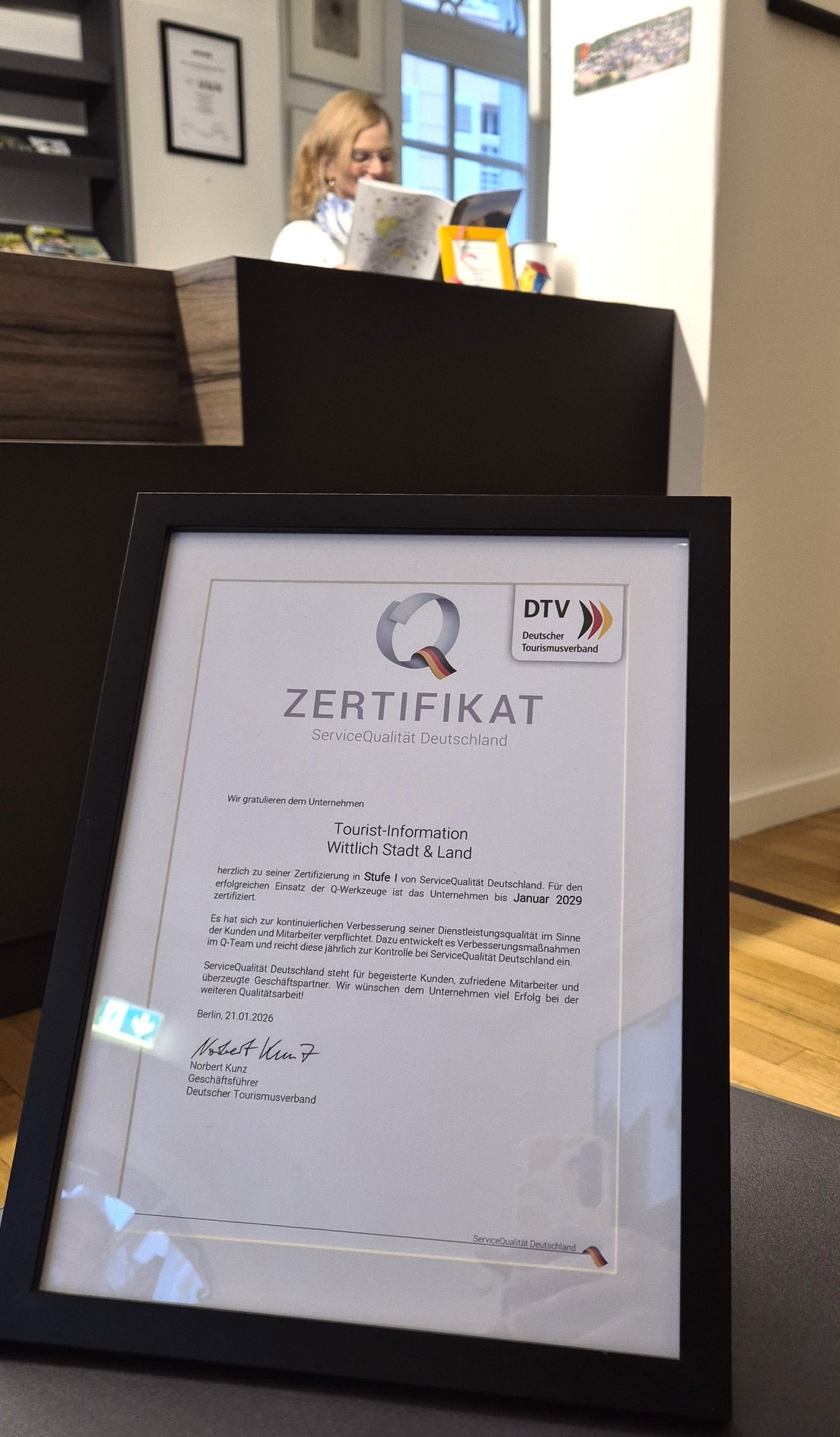 Mit Überreichung des Zertifikats darf die Tourist-Information Wittlich Stadt & Land für weitere drei Jahre bis Januar 2029 mit dem international bekannten Q der ServiceQualität Deutschland werben.
