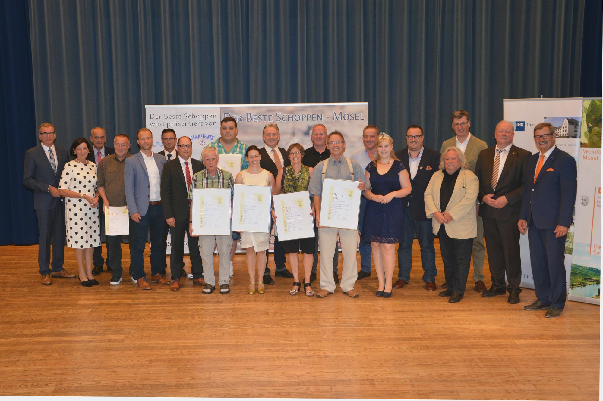 Der Hauptpreis geht an das Lokal „Himmelreich Weine“ in Graach. Bevor die besten Schoppenwirte ihre Preise entgegennehmen konnten, wurden im Juni und Juli 1.410 Weine von 269 Weinerzeugern im großen Test der offenen Ausschankweine von Mosel, Saar und Ruwer bewertet. 192 gastronomische Betriebe von Mosel, Eifel und Hunsrück sowie darüber hinaus hatten ihre Schoppenweine zum Wettbewerb eingereicht.