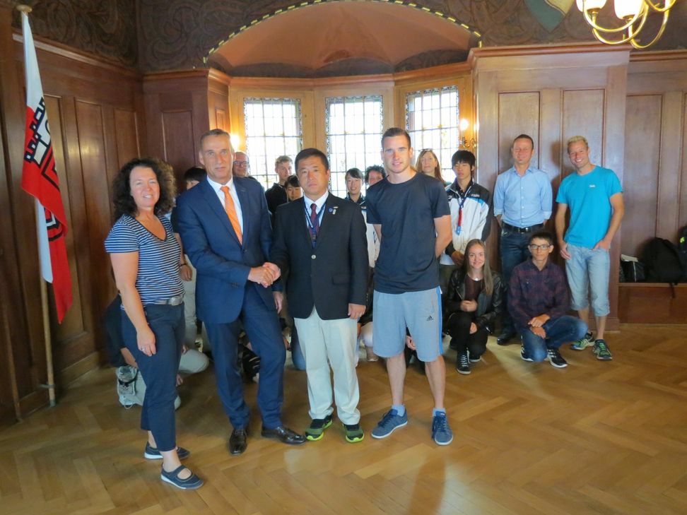 Der PSV Wengerohr war eine Woche Gastgeber von neun japanischen Jugendlichen und ihrem Betreuer. Sie wurden von Bürgermeister Joachim Rodenkirch hochoffiziell im Alten Rathaus begrüßt. Auf dem Foto vorne von links: Claudia Pütz, Geschäftsführerin PSV, Joachim Rodenkirch, Betreuer Japan Izumi Nakahara und Benedikt Vogedes, Sportstudent, ebenfalls vom PSV.   Foto: P.Geisbüsch,