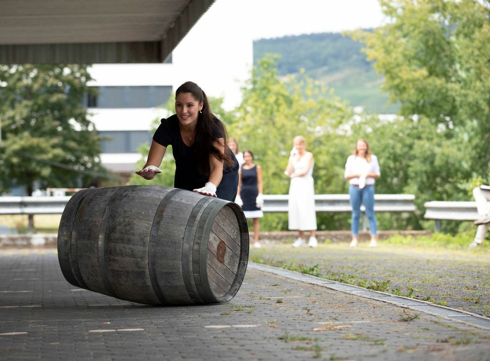 Im Wettbewerb „Moselland Royal“ mussten die fünf Weinhoheiten ihre Geschicklichkeit und ihre sensorischen Fähigkeiten unter Beweis stellen. Beim Barriquefassrollen gegen die Zeit schnitt die Deutsche Weinprinzessin Julia Böcklen am besten ab – in unschlagbaren 24 Sekunden meisterte sie die 100 m-Strecke im Hof der Moselland. Nach der Verkostung eines moseltypischen, feinherben Rieslings der Premiumlinie Goldschild mussten die Majestäten möglichst viele Punkte beim Darts erzielen, nach dem Motto „Riesling trifft immer“. Im Sensoriktest war es Aufgabe der Hoheiten, verschiedene Weinaromen richtig zu identifizieren. Gesamtsiegerin nach Punkten wurde die Deutsche Weinprinzessin Carolin Hillenbrand, die aus dem Anbaugebiet Hessische Bergstraße stammt.