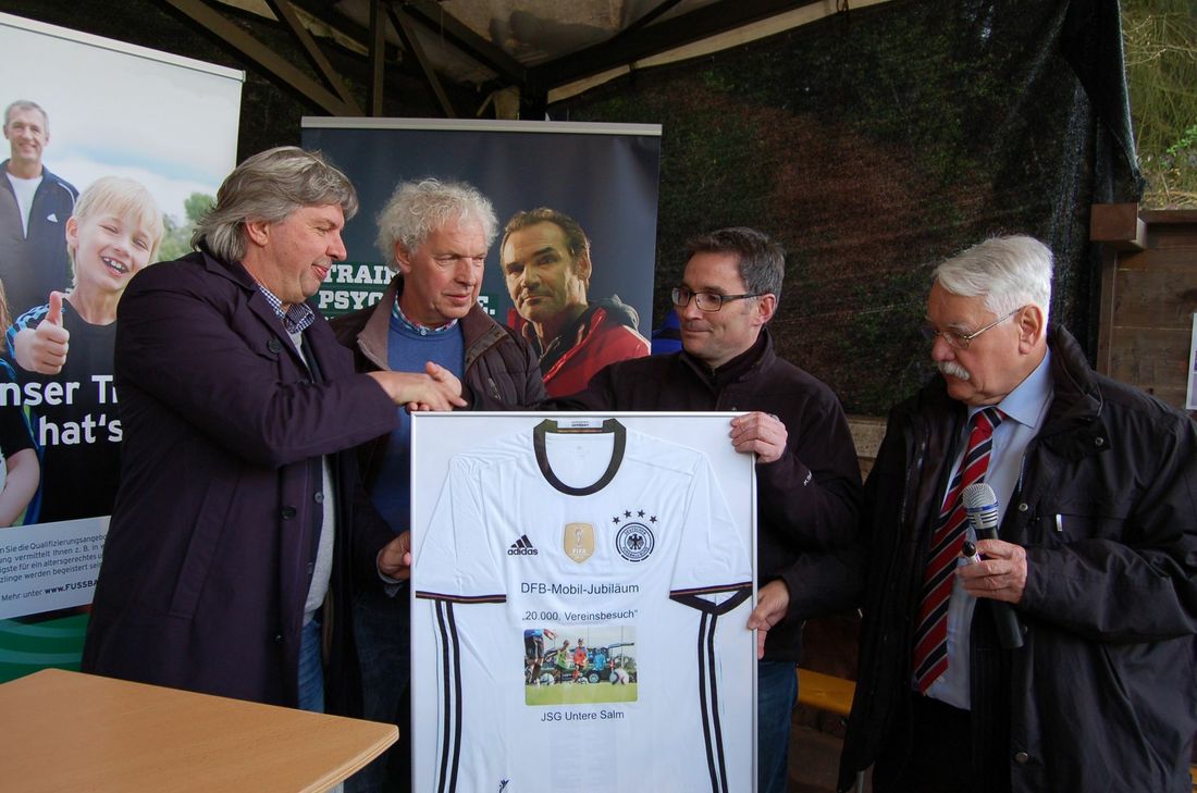 In ganz Deutschland sind jeden Tag 30 DFB-Mobile im Einsatz, haben seit dem Projektstart im Jahre 2009 mit Demo-Trainingseinheiten und Informationen rund um aktuelle Themen des Fußballs so bereits Hunderttausende von Nachwuchsspielern und Trainern erreicht – am Mittwoch nun kam es zum 20.000. Vereinsbesuch. Das Jubiläum wurde bei der Jugendspielgemeinschaft Untere Salm auf dem Kunstrasenplatz in Salmtal-Dörbach gefeiert.