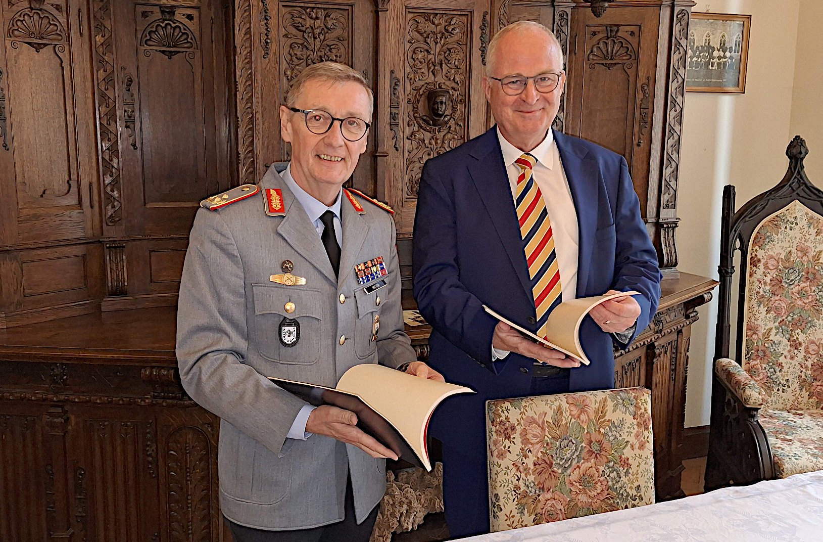Zum 75. Jahrestag wurde Himmerod erneut angefahren. Jetzt aber höchst offiziell, von gut 100 geladenen Gästen. Darunter vor allem ranghohe Vertreter der Bundeswehr. Einem ökumenischen Gottesdienst in der Kirche folgte ein Festakt mit musikalischer Begleitung von Musikern des Heeresmusikkorps Koblenz im einstigen Refektorium. Nach einem Grußwort des Hausherrn, Triers Bischof Dr. Stephan Ackermann, hielt General a.D. Eberhard Zorn, von 2018 bis 2023 Generalinspekteur der Bundeswehr, die Festrede.