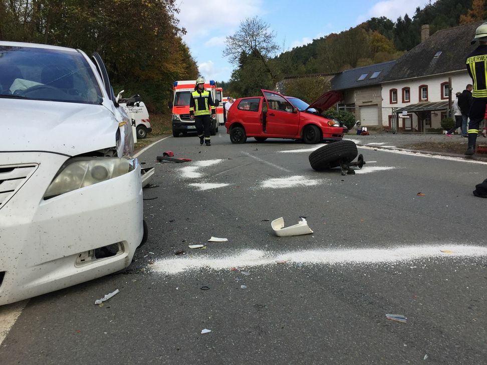 Drei Schwerverletzte sind die Folge eines Verkehrsunfalles, der sich am Samstag, 29. Oktober gegen 13.20 Uhr ereignete. Ein 20-jähriger Autofahrer befuhr die K 43 von Arenrath kommend in Richtung Niederkail. Am Ende einer Gefällstrecke fuhr er in einer leichten Rechtskurve in Anbetracht der besonderen örtlichen Straßenverhältnisse mit zu hoher, nicht angepasster Geschwindigkeit, so dass er auf die Gegenfahrbahn geriet. Hier stieß er trotz Vollbremsung mit einem PKW zusammen, der die K 43 in entgegengesetzter Richtung befuhr. Durch von starken Aufprall wurden an beiden Fahrzeugen die jeweiligen linken Vorderräder abgerissen. Im Fahrzeug des Unfallverursachers saßen drei Personen, wovon zwei schwerverletzt wurden. Im entgegenkommenden Fahrzeuges saßen zwei Personen, wovon eine schwer verletzt wurde. Die verletzten Unfallbeteiligten wurden durch das DRK in umliegenden Krankenhäuser gebracht. Im Einsatz waren die Feuerwehr Salmtal, das DRK mit Notarzt und die Polizei Wittlich.Fotos: agentursiko