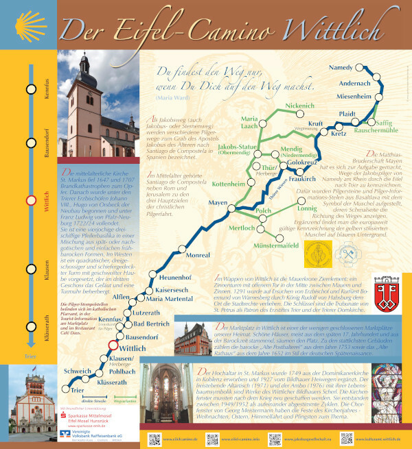 Heinz Schäfer dankte in seiner Ansprache dem Pfarrgemeinderat der Kirche St. Markus, dem Bürgermeister der Stadt Wittlich, den zahlreichen Unterstützern des Projektes, sowie natürlich den Vertretern der Sparkasse und der Volksbank - für die Spenden von jeweils 500 Euro. Das Geld wurde genutzt, um Layout und Material der Tafel zu bezahlen. Der Restbetrag und die Kosten für das Aufstellen übernimmt die Stadt Wittlich. Die Hinweistafeln informieren den Wanderer über die Streckenführung, die St.-Bruderschaft und einige Baudenkmäler am jeweiligen Standort. In Wittlich weist die Tafel natürlich auf den Hochaltar in St. Markus, aber auch auf den Marktplatz, die Alte Posthalterei und das Alte Rathaus hin. Dafür wird der Weg in Kürze auch so um geschildert, dass die Pilger durch den Kern der Altstadt gehen, die schönen Fassaden rund um den Marktplatz bewundern und sich sogar dann an der Tourist-Information ihren Pilger-Stempel geben lassen können. Die Tourist-Information ist eine von drei Stellen, an denen sich die Pilger im Pilger-Ausweis quittieren lassen können, dass sie in Wittlich waren - das geht auch im katholischen Pfarramt und in Restaurant Café Daus. Bürgermeister Joachim Rodenkirch freute sich in seiner Ansprache über das gelungene Layout und den Mehrwert der Informationen, die der Pilger durch die Tafel erhält, wenn er durch Wittlich zieht. Besonders in der heutigen Zeit scheine es, dass das Pilgern aktuell eine Renaissance erhalte: Das "Sinn-Suchen", Innehalten und "den eigenen Weg finden" gewinne wieder mehr an Bedeutung und ziehe sich durch alle Altersgruppen. Passend dazu wird am Freitag, 10. Mai, in Wittlich-Wengerohr zusammen mit Bürgermeister und Ortsvorsteher der Pilgerstein feierlich eingesegnet. RED