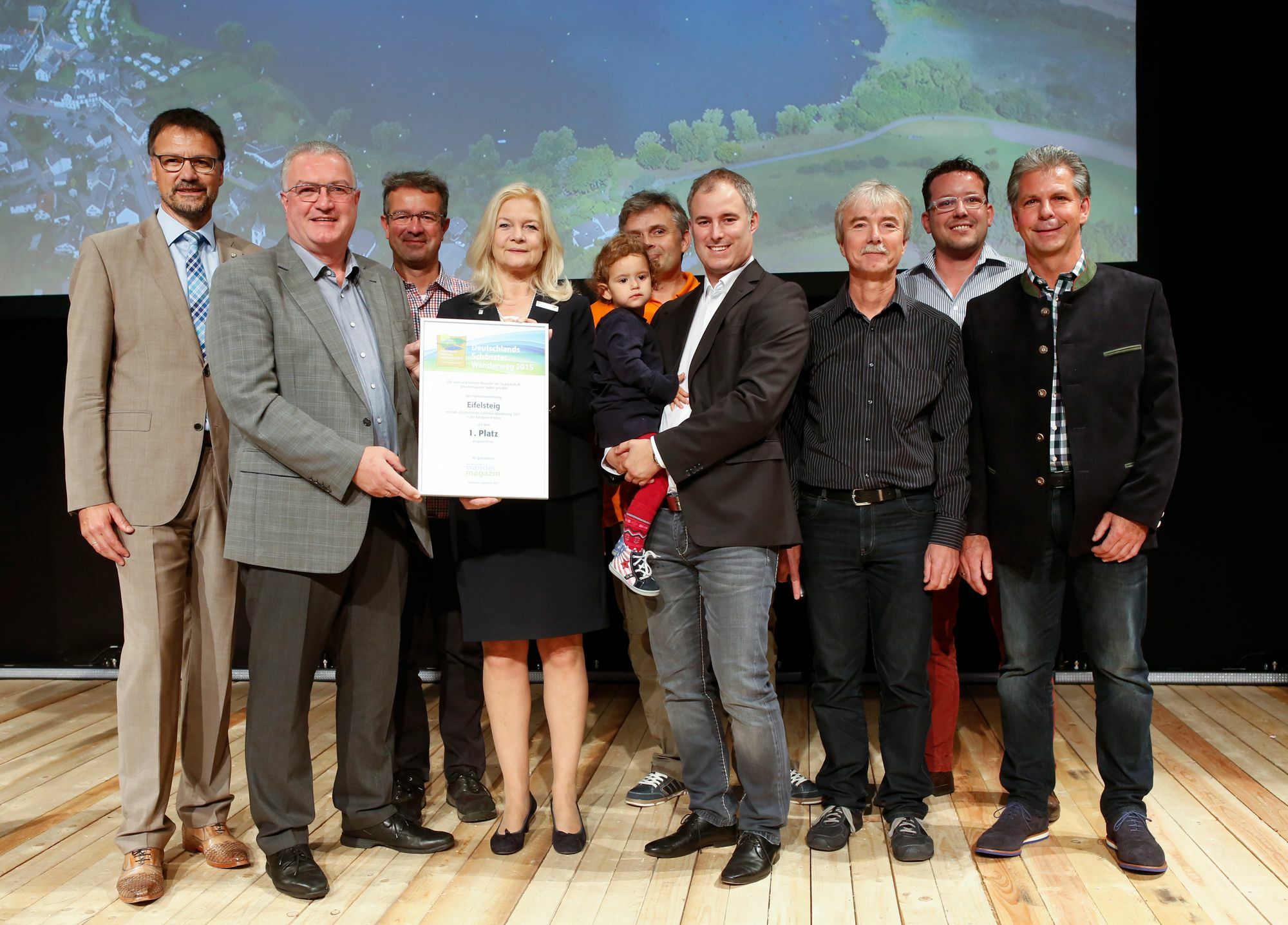 Im Rahmen der Düsseldorfer Wander- und Trekkingmesse TourNatur zeichnete die Fachzeitschrift Wandermagazin "Deutschlands schönste Wanderwege" aus. 16.800 Wanderer, Leser der Zeitschrift Wandermagazin und deren Internetnutzer gaben ihre Stimme für eine von zehn nominierten Tagestouren und einen von fünf nominierten Weitwanderwegen ab. Bei den Weitwanderwegen wurde der Eifelsteig zwischen Aachen und Trier auf Platz 1 gewählt, der Goldsteig in Bayern schaffte es auf Platz zwei, der Lahnwanderweg (Nordrhein-Westfalen/Hessen/Rheinland Pfalz) auf Platz drei. Ein Zitat von Manuel Andrack, einem prominenten Fan des Eifelsteigs, bei der Prämierung dabei: "Ich habe ihn mal den Glückssteig genannt, habe das Ministertreffen der beiden betroffenen Bundesländer bei der Eröffnung begleitet und so manchen Kilometer der Trasse selbst unter die Füße genommen und weiß, worum es geht. Mit 53,57 % der abgegebenen Stimmen, das waren immerhin 9.021 Wähler und damit ein überwältigender Liebesbeweis für diesen Weg, war der Eifelsteig der Abräumer der diesjährigen Wahl." Foto: Messe Duesseldorf / ctillmann