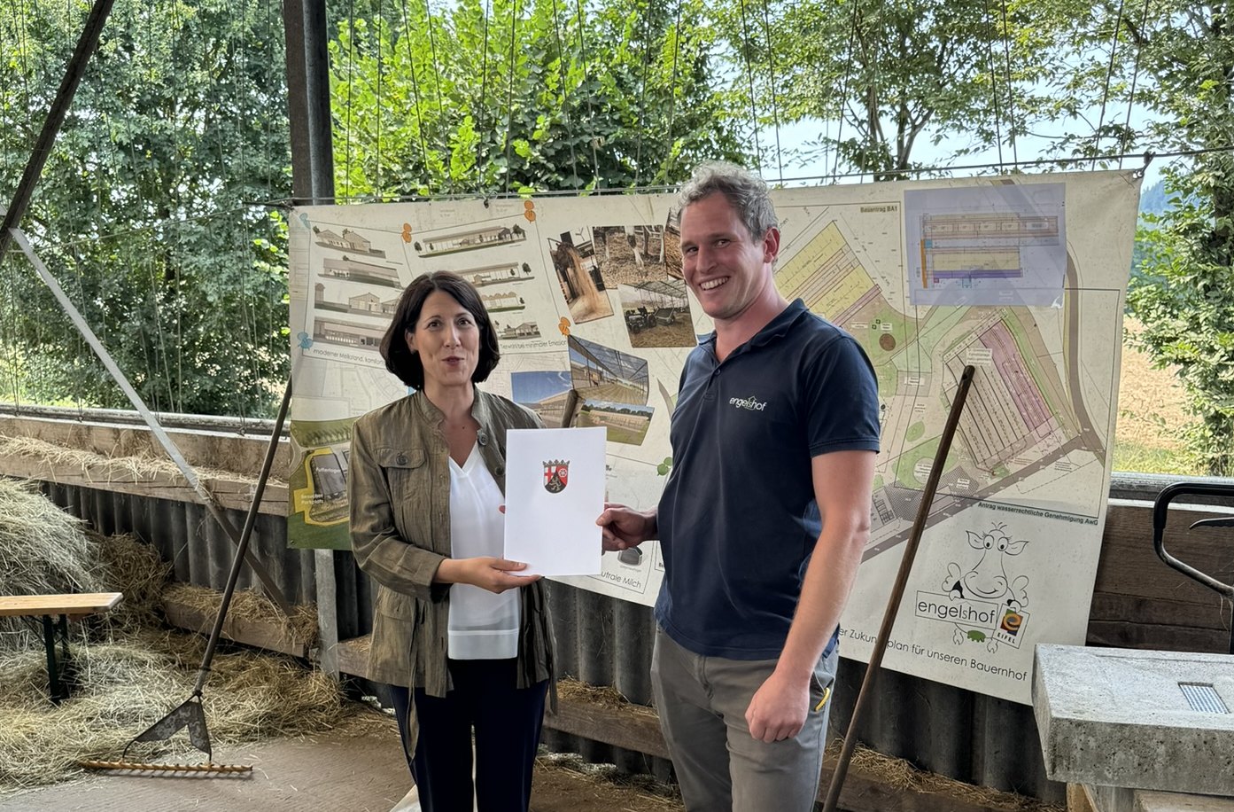 „Der Engelshof zeigt vorbildhaft auf, wie ein landwirtschaftlicher Familienbetrieb erfolgreich auf die Herausforderungen des Marktes reagiert und dabei auch innovative Wege beschreitet“, sagte Schmitt. Die geplante Investition umfasst unter anderem den Neubau eines modernen, weitgehend automatisierten und energieautarken Milchviehstalls. Besonders hervorzuheben sind das innovative, zu öffnende Dach sowie die Integration eines Besucherbereichs mit Aussichtsplattform, der Einblicke in die moderne Landwirtschaft ermöglichen soll.