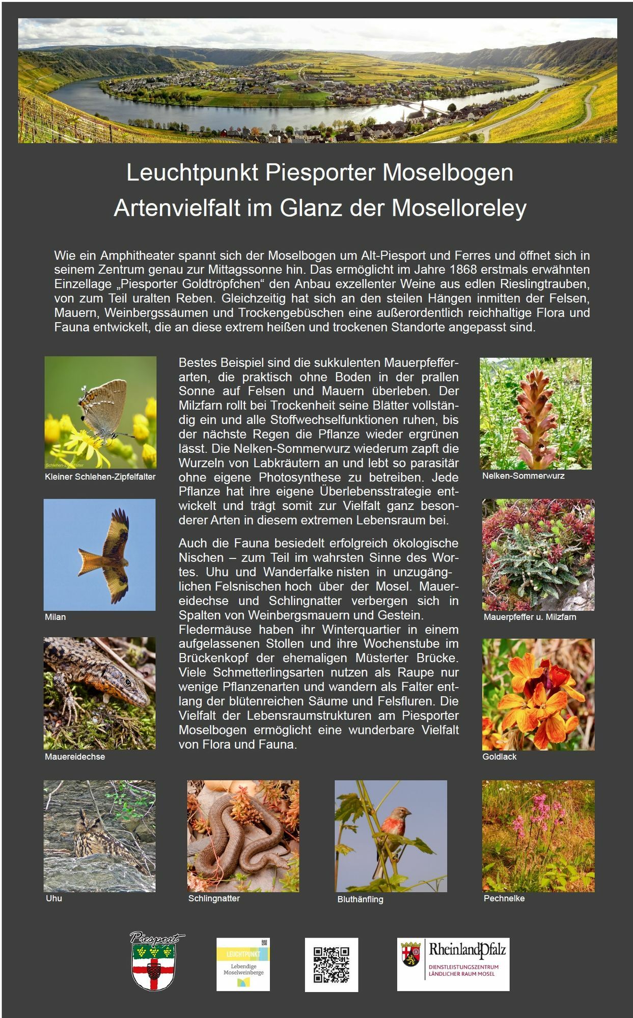 Indes können Interessierte nicht nur auf den medialen Kanälen neue Eindrücke sammeln, auch vor Ort, beispielsweise an den neuen Informationstafeln (siehe Bildergalerie), gibt es allerhand Wissenswertes zu Flora, Fauna und Geologie im Piesporter Moselbogen zu entdecken.