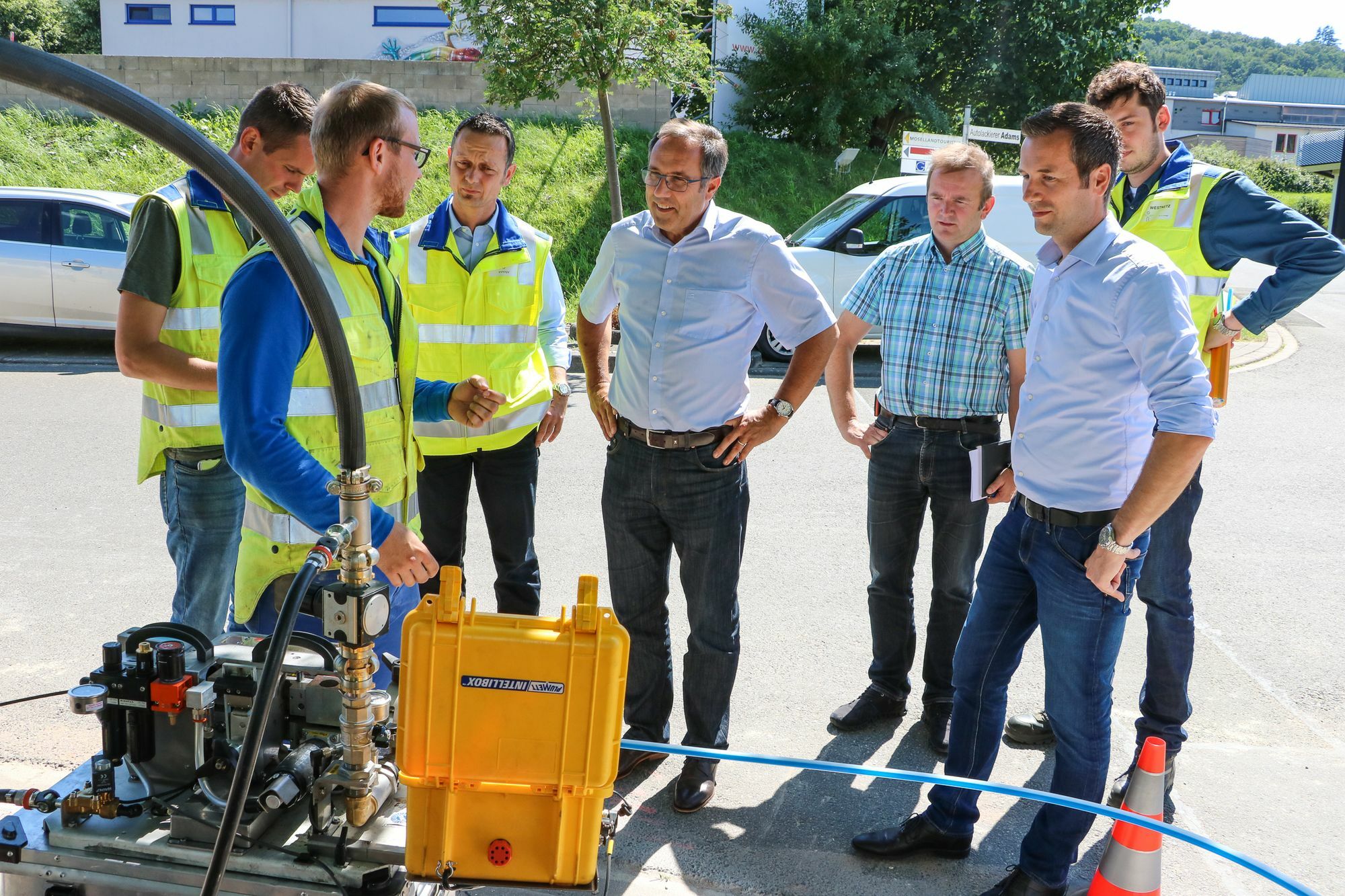 In vielen Gemeinden des Landkreises Bernkastel-Wittlich sah es mit schnellem Internet bislang nicht sehr rosig aus. Vor drei Monaten erfolgte jedoch der Spatenstich zum gemeinsamen Ausbau eines Hochgeschwindigkeits-Internetnetzes durch den Landkreis und den Netzbetreiber innogy TelNet GmbH. Um sich persönlich ein Bild vom Fortschritt der Bauarbeiten zu machen, kamen kürzlich Vertreter des Landkreises, der Politik und der Presse im Gewerbegebiet Mülheim/Andel in Bernkastel-Kues zusammen. Landrat Gregor Eibes freute sich ob der positiven Entwicklung und warf ein interessiertes Auge auf die Arbeit des Montageteams, welches gerade dabei war, Glasfaserkabel in die vorhandenen Lehrrohre einzublasen. Bei diesem Arbeitsschritt werden mittels Kompressor und Einblasgerät hochfaserige Lichtwellenleiterkabel über Distanzen von bis zu mehreren Kilometern in die zuvor verlegten Leerrohre eingebracht. Aus Sicht der Unternehmen war es in der Vergangenheit häufig nicht wirtschaftlich, kleinere Orte mit schnellem Internet zu versorgen, weiß Landrat Gregor Eibes. Diese Wirtschaftlichkeitslücke hat der Landkreis gemeinsam mit den kreisangehörigen Kommunen nun geschlossen. Damit auch die letzten „weißen Flecken“ von der Karte verschwinden, fördert das Bundesministerium für Verkehr und digitale Infrastruktur die Erschließung mit sechs Millionen Euro. Vom Land Rheinland-Pfalz kommen weitere 4,8 Millionen Euro hinzu, die Kommunen steuern mit ihrem Eigenanteil insgesamt 1,2 Millionen Euro bei. Die Gesamtinvestitionen im Landkreis Bernkastel-Wittlich betragen rund 33 Millionen Euro. Mit diesem finanziellen Großprojekt sollen rund 6.300 heute noch unterversorgte Adressen, darunter 230 Gewerbetreibende und 37 Schulstandorte, von deutlich höheren Bandbreiten profitieren und Zugang zur Internet-Autobahn erhalten. Dabei sollen bis Ende Herbst 2019 insgesamt 550 Kilometer neue Glasfaserkabel im gesamten Kreisgebiet verlegt werden. Dadurch werden alle Gemeinden im Projektgebiet mit mindestens 50 Megabit pro Sekunde an das Internet angebunden, etwa 98 Prozent der Haushalte werden sogar mit 100 Megabit oder mehr versorgt. Darüber hinaus erhalten rund ein Viertel aller Ausbauadressen einen Glasfaserhausanschluss, der noch höhere Bandbreiten ermöglicht. Für viele Gewerbetreibende und Schulen werden überdies Gigabitverbindungen zur Verfügung stehen. Die Bauarbeiten werden mit Hochdruck vorangetrieben: Bislang wurde auf einer Trassenlänge von über 105 Kilometern neue Glasfaserinfrastruktur errichtet. Der Schwerpunkt der Bauarbeiten lag in den ersten Monaten in über 20 Gemeinden. „Der Ausbau erfolgt mit regionalen Tiefbau-Unternehmen, so dass die Wirtschaftskraft vor Ort gestärkt wird. Damit die Bürger im Landkreis möglichst schnell vom neuen Internet profitieren können, erfolgt der Ausbau in vielen Gemeinden gleichzeitig. Mit dem Fortschritt der Bauarbeiten liegen wir sehr gut im Zeitplan“, freut sich Projektleiter Fabian Stüber von Westnetz, dem für den Netzbau zuständigen Verteilnetzbetreiber von innogy. Ab Ende Juni können so bereits die Gemeinden Rorodt und Etgert und im Juli die Gemeinden Salmtal und Hasborn ans schnelle Netz mit Geschwindigkeiten bis 120 Megabit pro Sekunde gehen. Alle weiteren Inbetriebnahmen sind im gesamten Ausbaugebiet bis Ende Herbst 2019 vorgesehen. Im Gewerbegebiet in Mülheim/Andel begutachteten die Anwesenden einen weiteren wichtigen Punkt des Breitbandausbaus: den neuen, sogenannten POP-Standort (Point of Presence). Bei diesem zentralen technischen Gebäude handelt es sich um einen von insgesamt fünf Zugangsknoten, die für die Verbindung zur Datenautobahn benötigt werden. So dient speziell der neue POP Bernkastel-Kues der Anbindung aller Gemeinden im Ausbaugebiet entlang der Mosel an das schnelle Internet an den Backbone-Ring Rheinland-Pfalz. Eine Karte des Ausbaugebietes und den Bauabschnittsplan finden Interessierte auf der Internetseite des Landkreises www.bernkastel-wittlich.de unter dem Stichwort Breitband. Weiterhin werden in vielen Orten vor der Inbetriebnahme der neuen Technik Informationsveranstaltungen des Netzbetreibers innogy TelNet GmbH stattfinden, zu der Anwohner und Gewerbetriebende rechtzeitig über die Presse oder per Hauspostwurfsendung eingeladen werden. Foto: FF