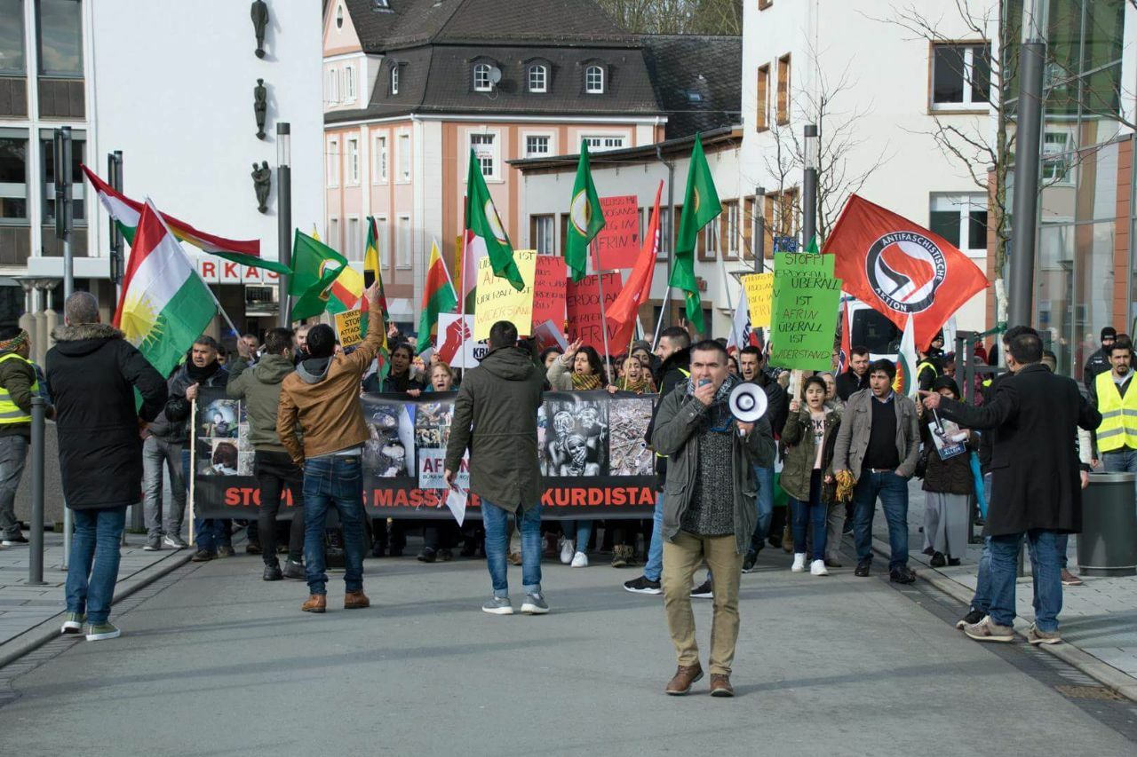 Am Samstag,3. Februar haben ca. 250 Menschen unter dem Motto "Afrin ist nicht allein!" zwei Stunden lang friedlich gegen den Angriffskrieg der türkischen Regierung auf die kurdische Region um Afrim demonstriert. Organisiert wurde die Demonstration von der kurdischen Gemeinde Wittlich. Die Partei Die Linke rief zur Beteiligung auf. Für diese sprach Tom Ebertz, Vorstandsmitglied im Landkreis Bernkastel-Wittlich, und forderte, dass die Bundesregierung Rückgrat zeigen möge, gegen den türkischen Präsidenten Erdogan, der eine angebliche "Terrorgefahr" als Begründung für den Angriffskrieg aufführe. Diese Begründung sei hahnebüschen, da auf Seiten der Türkei islamistische Melizen kämpften. Ebertz stellte heraus, dass die YPG und andere kurdische Organisationen inzwischen eine Untersuchung durch Menschenrechtsorganisationen fordern, da sie in dem Angriff Verstöße gegen das internationale Menschenrecht sehen. Foto: privat