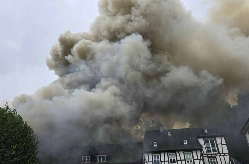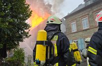Die Löscharbeiten dauern weiter an, der Brand hat auf den Dachstuhl eines Nachbargebäudes übergegriffen. Eine Person wird wegen einer Rauchgasintoxikation ärztlich behandelt.
