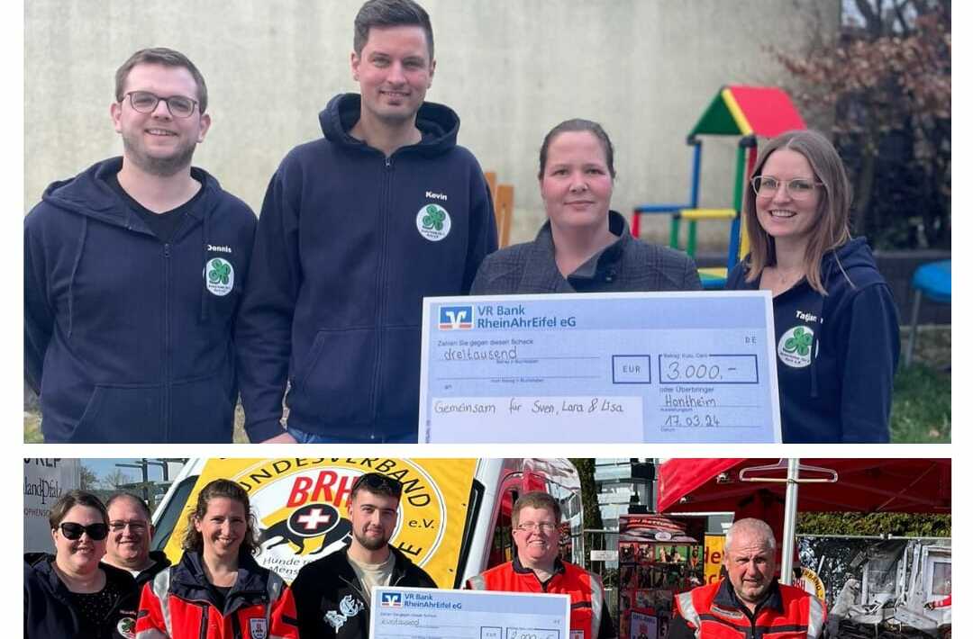 Die gemeinsamen Spenden im Wert von 5000 Euro wurden nun in Hontheim und Wittlich von den Mitgliedern persönlich an Lisa Hayer und den Mitgliedern der BRH Rettungshundestaffel Eifel- Mosel überreicht. An die Spendenaktion "Gemeinsam für Sven, Lara und Lisa" gingen 3000 Euro (inkl. den 1000 Euro aus Rengen). Im September letzten Jahres, nur 48 Stunden nach Sven und Lisas Hochzeit platze ein Aneurysma ins Svens Kopf und infolgedessen erlitt er in derselben Woche drei Schlaganfälle. Zurzeit benötigt Sven intensive Pflege.