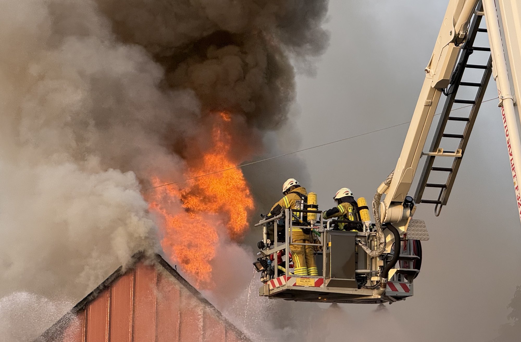 Als erste traf die örtliche Feuerwehr von Lötzbeuren ein. Geistesgegenwärtig bauten die Einsatzkräfte sofort eine sogenannte Riegelstellung auf, um die unmittelbar angrenzenden Gebäude links und rechts der brennenden Scheune vor den Flammen zu schützen. Die etwa 50 mal 20 Meter große Lagerhalle stand bereits bei Eintreffen der Feuerwehr in voller Ausdehnung in Brand.