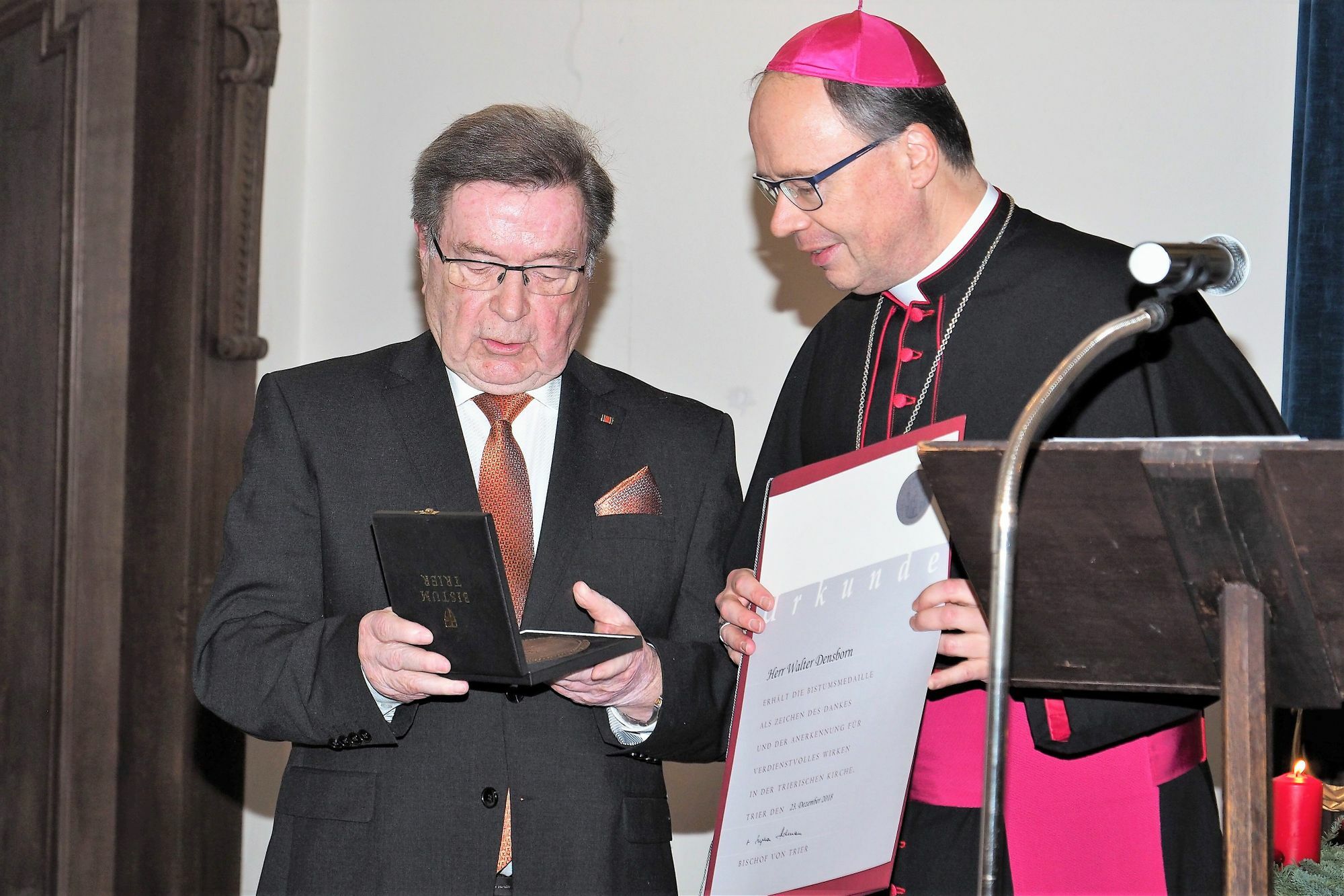 Für seine besonderen Verdienste um den Erhalt der Abtei Himmerod hat Bischof Dr. Stephan Ackermann am 23. Dezember den ehemaligen Bürgermeister der Verbandsgemeinde Manderscheid, Walter Densborn, mit der Bistumsmedaille ausgezeichnet. Mehr als zwei Jahrzehnte lang hat sich Densborn als Lokalpolitiker und Privatperson für zahlreiche wirtschaftliche, bauliche und kulturelle Belange und zuletzt entscheidend für den Fortbestand der Zisterzienserabtei im Salmtal eingesetzt.