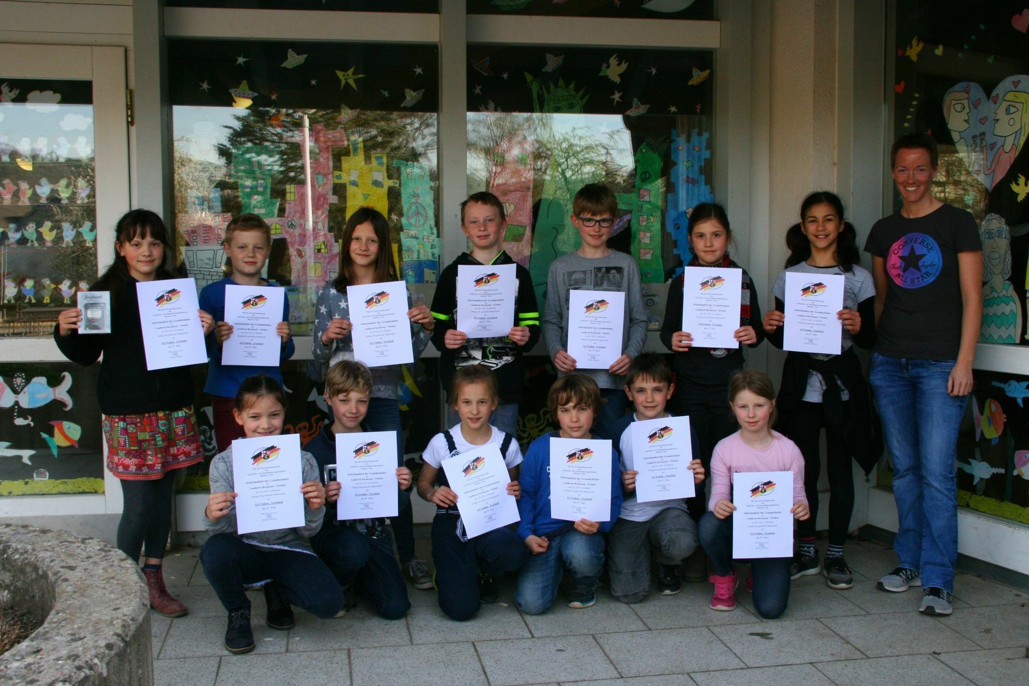 Ende März fand in Wittlich im Vitelliusbad die Kreismeisterschaft im Schwimmen statt. Dort war die Grundschule Traben-Trarbach mit einer gemischten Mannschaft am Start. In spannenden Entscheidungen – Sprintstaffel, Ballstaffel sowie im Ausdauerschwimmen - gaben die Schülerinnen und Schüler ihr Bestes. So war der Jubel groß, als bei der Siegerehrung der erste Platz an die Mannschaft ging. Neben Urkunden durften die Kinder noch eine neue Stoppuhr und ein Slalom-Tauchspiel für den Schwimmunterricht entgegennehmen. Bereits Anfang März fand in Piesport die Endrunde der Kreismeisterschaft Fußball statt. Die Mannschaft der GSTT startete erfolgreich ins Turnier und zeigte eine ausgefeilte Spieltaktik, kluge Spielzüge und ein durchweg sicheres Passspiel. Durch nur zwei Gegentreffer verpassten die Schüler nur knapp den Einzug ins Finale, setzten sich aber im kleinen Finale durch und errangen einen sehr guten dritten Platz. Fotos: Schule
