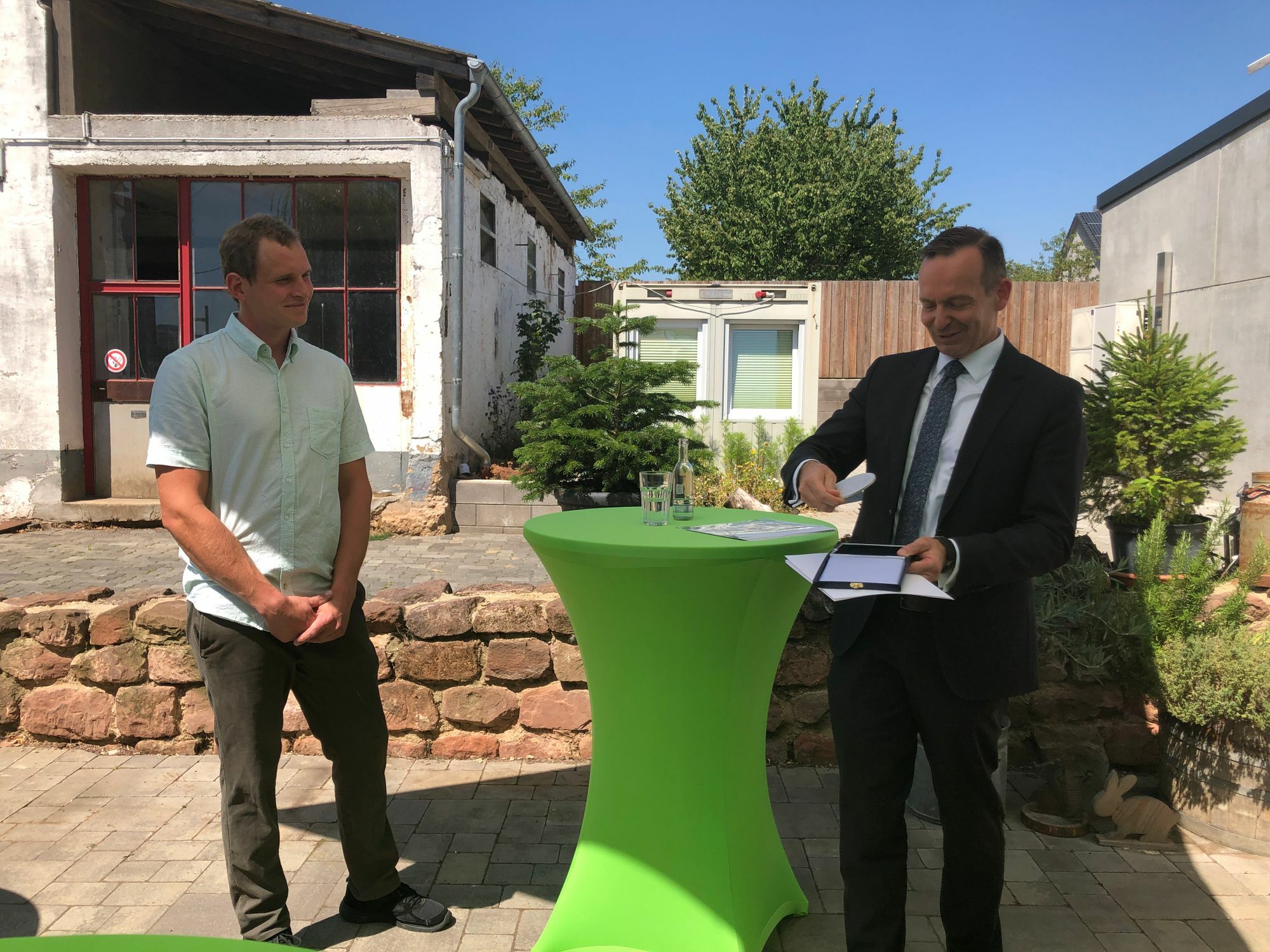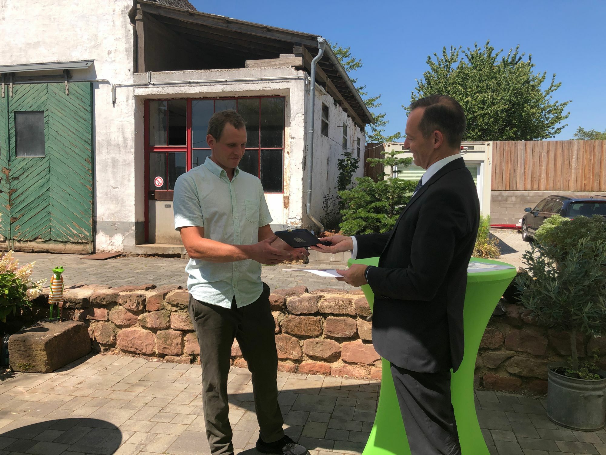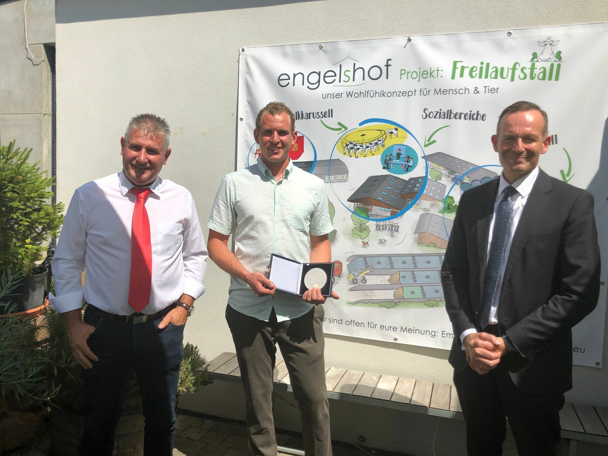 „Ohne die Landwirtschaft gibt es auch keine landwirtschaftlichen Produkte“. Das sagte der rheinland-pfälzische Minister für Wirtschaft, Verkehr, Landwirtschaft und Weinbau, Dr. Volker Wissing, bei seinem Besuch in Hetzerath in der Molkerei Engelshof. Im Rahmen seiner Sommerreise 2020 besucht er u.a. innovative Betriebe aus den Bereichen Tourismus und Landwirtschaft und ist zu Gast bei Entwicklerunternehmen im Gesundheits- und Logistikbereich. Am Mittwoch, 5. August überreichte er Junglandwirt David Engel die Wirtschaftsmedaille für seine Verdienste in der Landwirtschaft. David Engel gebe der Landwirtschaft ein junges, modernes Gesicht. Besonders die Nutzung der sozialen Medien, darunter Videos auf YouTube, lobte der Minister. Der Engelshof mit seiner regionalen Vermarktung, seinen naturbelassenen sowie gentechnikfreien Produkten und dem Augenmerk auf das Wohl der Tiere gehöre zu einer modernen Landwirtschaft, die qualifizierte und kreative Unternehmer verlangt. Diese Landwirtschaft sei für ein ländlich geprägtes Bundesland wie Rheinland-Pflanz von besonderer Bedeutung. „Wenn wir Zukunftsperspektiven wollen, dann brauchen wir auch Landwirtschaft und Landwirte“, so der Minister. Gerade die Milchviehhaltung sei wichtig, da sie einen Beitrag zur Pflege der hiesigen Kulturlandschaft leiste. Diesen Beitrag honorierter der Minister mit der Medaille, die David Engel dankend entgegennahm. „Ich freue mich tierisch, die ganze Familie freut sich – auch, weil die Wirtschaftsmedaille in die Landwirtschaft gegangen ist.“ Engel betonte, dass die ganze Arbeit ohne seine Familie nicht möglich wäre. Übernommen hat er den Hof etwa 2 Jahren. Noch bis 2015 war der Hof ein konventioneller Betrieb. Diesen Weg wollte die Familie aber nicht mehr gehen. “Wir wollten eine höhere Wertschöpfung aus der Milch ziehen und mithilfe dieser den Hof so zu gestalten, wie die Leute es sich vorstellen. Mehr Tierwohl aber auch ‚Menschenwohl‘ für diejenigen, die hier mitarbeiten.“ Diese Neuausrichtung war aber nur der erste Schritt. In Zukunft will sich der Familienbetrieb zum Arbeitgeberbetrieb wandeln. Dazu soll es u. a. neue Ställe und neue Büros geben. „Das zeigt auch den Kunden, dass das ‚Mehr-Geld‘, was sie in die Milch investieren, wieder in die Stallungen zurückfließt. (ju)