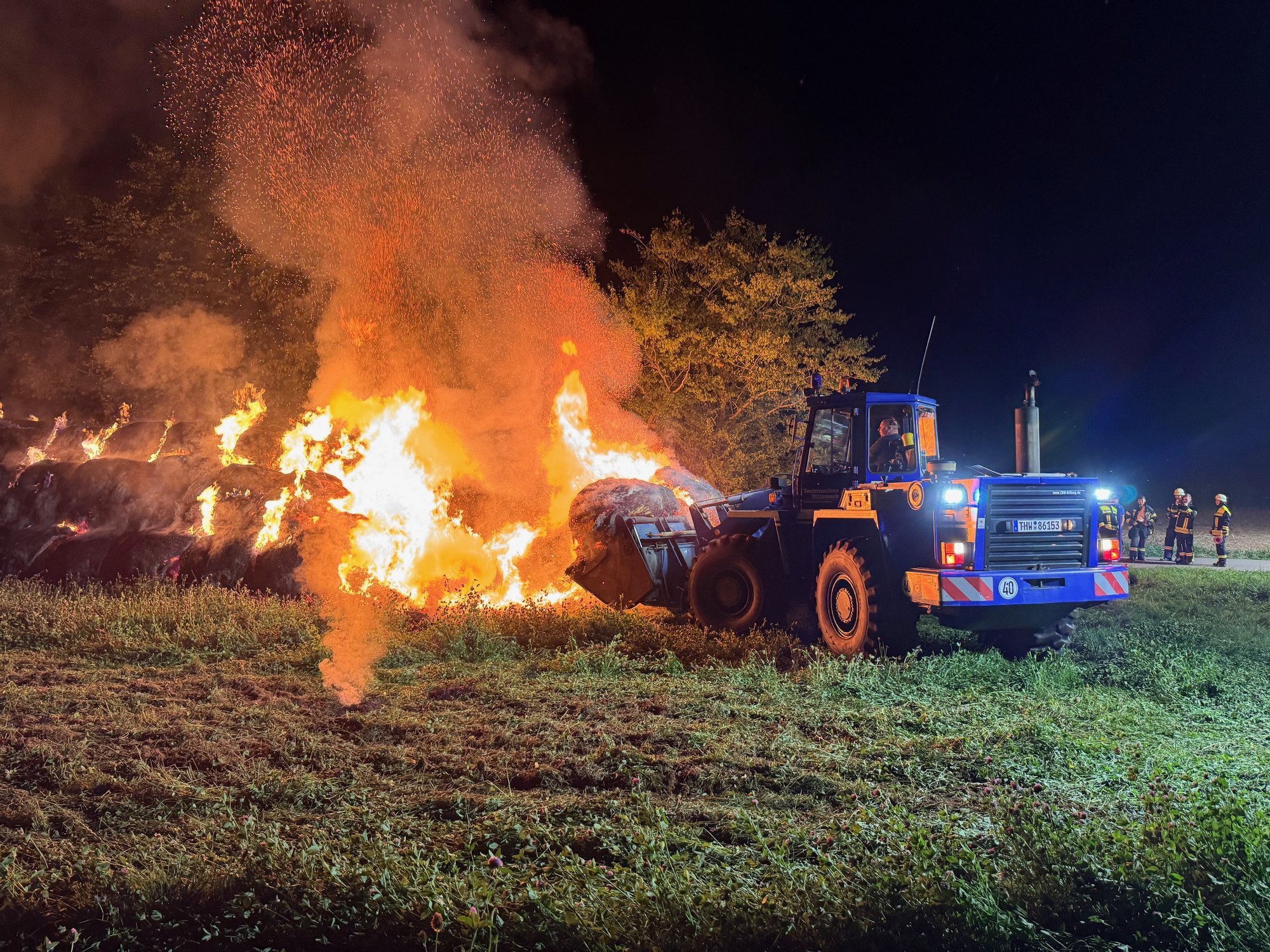 Durch die Steifenbesatzung wurde festgestellt, dass ein Stapel Heuballen in Brand geraten war. Die Feuerwehr kam mit starken Kräften vor Ort und verhinderter das Übergreifen der Flammen auf die umliegende Vegetation. Der Brand war schnell unter Kontrolle. In der Folge wurde die Führung des THW Wittlich, sowie das THW Bitburg mit Radlader hinzugezogen.Mehrere Stunden lang wurde gemeinsam wurde die Rundballenmiete auseinander gezogen und nach und nach gelöscht.