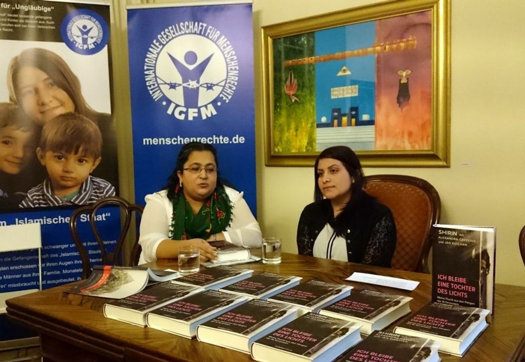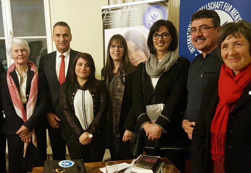 Der IGFM-Koordinator für die Irakhilfe, Khalil Al Rasho, berichtete über das Projekt für misshandelte IS-Opfer und die Humanitäre Hilfe vor Ort. Carmen Jondral-Schuler, IGFM-Vorstandsmitglied, warb für die von der IGFM initiierte Petition zur Errichtung eines Kriegsverbrechertribunals über den vom IS begangenen Genozid gegen religiöse und ethnische Minderheiten vor dem Internationalen Strafgerichtshof in Den Haag. Die Petition kann unter www.igfm.de heruntergeladen werden.