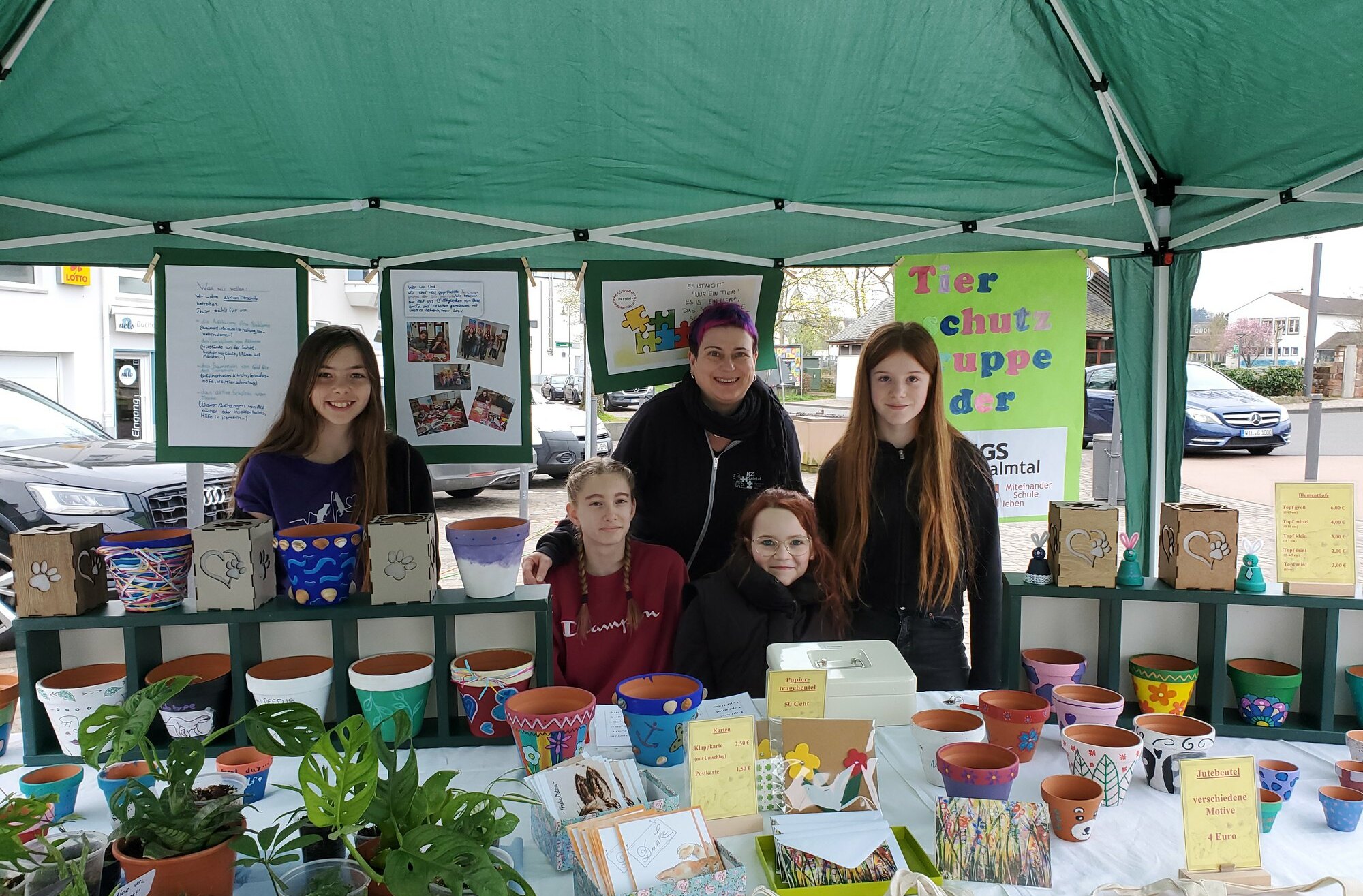 Ein Verkauf auf dem Wittlicher Wochenmarkt war die erste gemeinsame Aktion. In den letzten Wochen hatten die Schülerinnen und Schüler in der Freizeit fleißig Blumentöpfe mit Frühlings- und Ostermotiven bemalt und gestaltet. Eine Schülerin gestaltete darüber hinaus zwei Kartenmotive, mit denen man seinen Liebsten nette Oster- oder Frühlingsgrüße senden konnte. Beim Verkauf wurden über 350 Euro eingenommen. Das Geld kommt nun den Tieren des Eifeltierheims in Altrich und dem dazugehörigen Förderverein zu Gute. Der nächste Verkaufstermin steht auch schon fest, nämlich während des Tierheimfestes in Altrich am Sonntag, 7. April.
