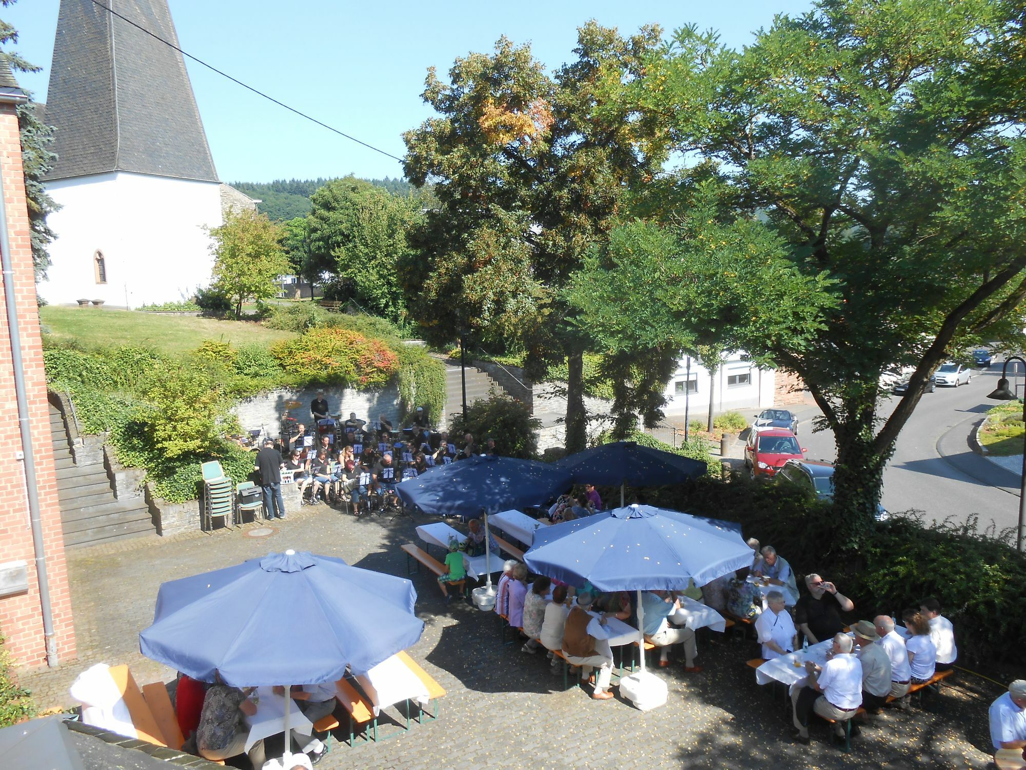 Das Fest wurde anschließend im Pfarrheim und Pfarrhof weitergeführt mit einem Frühschoppen des Musikvereins Lüxem. Die “Lüxemer Frauen” boten ihre selbstgefertigten Kränze für einen guten Zweck an.