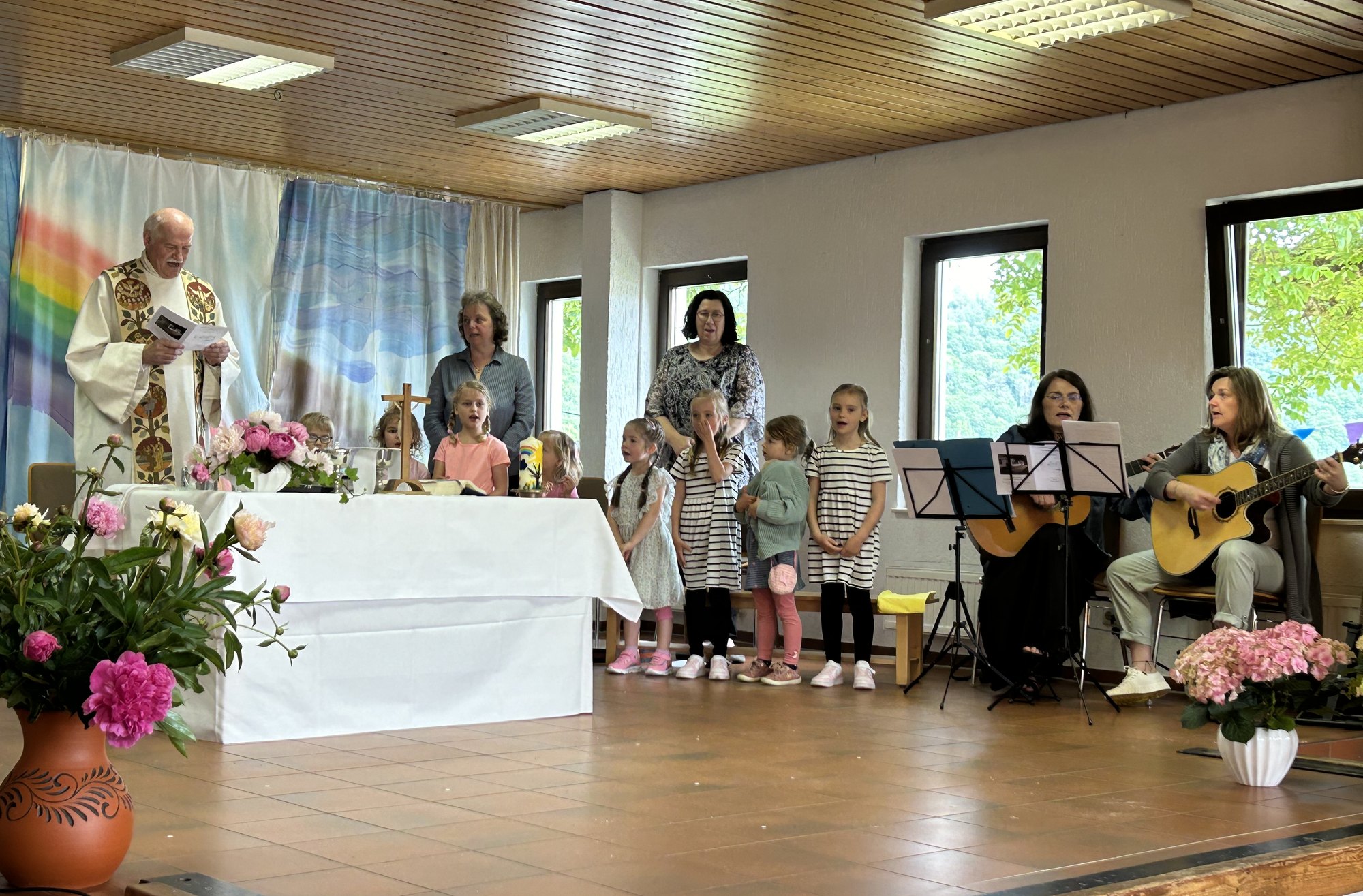 Nach einem eindrucksvollen Familiengottesdienst begrüßen die Kinder die zahlreichen Gäste, bevor die Grußworte folgen. Mit dem Lied "Bei uns in der Kita" ernten die Kinder einen Riesenapplaus und es ging weiter mit Spiel und Spaß rund um die Kita. Für das leibliche Wohl war bestens gesorgt und neben den vielen Aktionen für Kinder und Erwachsene war der Auftritt des Clowns Filou der Höhepunkt des Nachmittags.