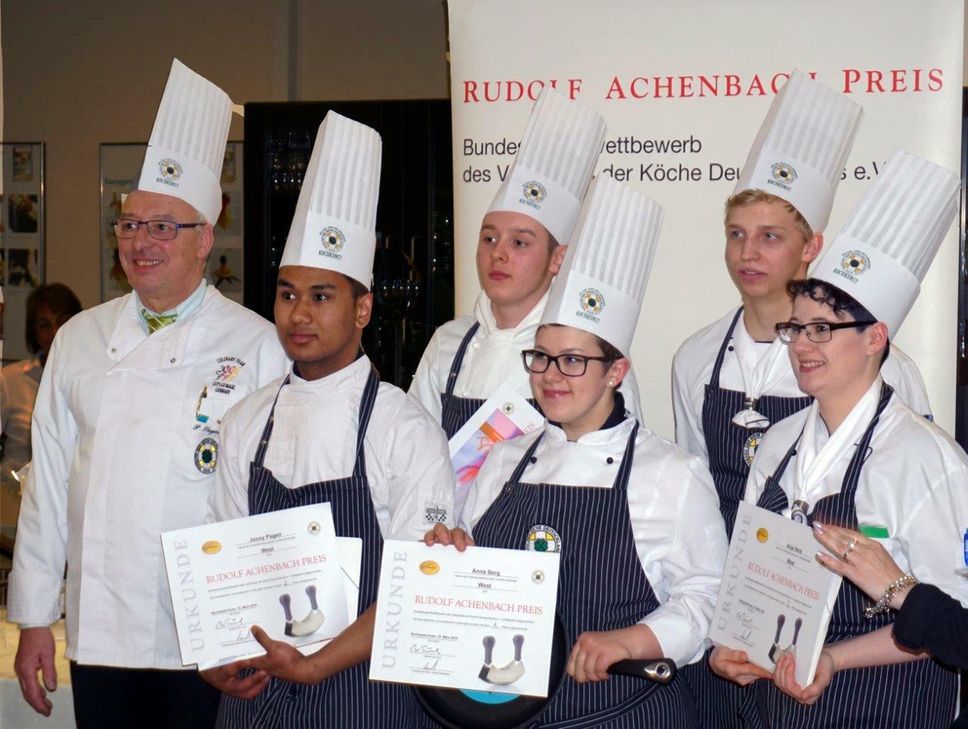 Im März fand die Qualifikationsrunde für die Teilnahmen am der Bundesjugendwettbewerb für junge Köchinnen und Köche in Bernkastel-Kues statt. Seit 1975 wird dieser Wettbewerb von der Achenbach Delikatessen Manufaktur finanziert und in Zusammenarbeit mit dem Verband der Köche Deutschlands e.V. (VKD) organisiert. Dieser älteste, von Firmengründer Rudolf Achenbach initiierte Wettbewerb der weißen Brigade, ist zum jährlichen Branchen-Highlight mit hohem Stellenwert avanciert. Die teilnehmenden Auszubildenden können sich im internen Wettbewerb der örtlichen Zweigvereine der VDK für die regionale Ausscheidung der jeweilige Landesverbände (LV) qualifizieren. Die neun Erstplatzierten qualifizieren sich anschließend für die Endrunde in Frankfurt am Main im Best Western Premier IB-Hotel Friedberger Warte. Anlässlich seines vierzigjährigen Jubiläums organisierte der Köcheverein Mittelmosel e.V. den diesjährigen Landeswettbewerb für die Teilnahme am Bundesjugendwettbewerb in Frankfurt, dieses Jahr in der Hotelfachschule in Bernkastel-Kues. Neben der Zubereitung der Speisen mussten die angehenden Gourmet-Köchinnen und Köche außerdem ihr können in der Präsentation der Gerichte, Warenkunde und Kalkulation sowie Organisation und Sauberkeit am Arbeitsplatz unter Beweis stellen. Landessiegerin wurde Anna Berg, Auszubildende aus Gasthaus Herrig in Meckel. Den zweiten Platz belegte Jonny Pagen, Restaurant á la Minute in Trier, gefolgt von Anja Heck, Gesellschaftshaus der BASF SE in Osthofen. Christian Saul, Gesellschaftshaus der BASF SE in Osthofen und Leon Konrad, Hotel Weißer Bär Müllheim-Mosel belegten beide den vierten Platz. Im Rahmen der Feierlichkeiten wurde Lothar Hangauer, Lehrer für Praktisches Kochen i. R. in der Hotelfachschule in Bernkastel-Kues, für vier Jahrzehnte Engagement in der Organisation und Betreuung der Landeswettbewerbe geehrt. Im Namen des Landesverbandes Südwest sowie der Firma Rudolf Achenbach wurde Hangauer die Ehrennadel in Gold mit Brillant verliehen. Auf dem Foto von links nach rechts: Peter Siegmund,Vorsitzender VKD Landesverband West, Jonny Pajen, Leon Conrad, Anna Berg, Christian Saul, Anja Heck, Bianca Betz. Foto: FF