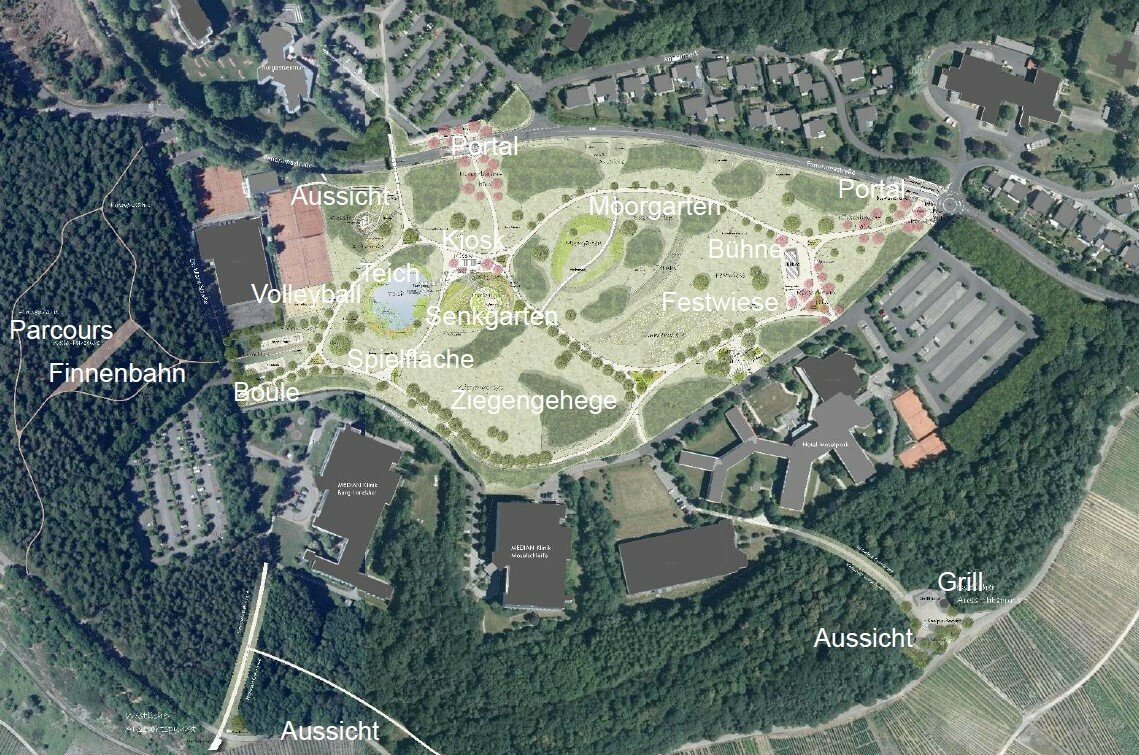 Der Kurpark soll als naturnaher Erlebnis- und Therapieraum ausgebaut werden, mit Nebel-und Naschgarten, Moorgarten und Teichanlage. Außerdem sind Spielelemente für Jung und Alt, Sitzgruppen und eine Bühne mit Eventfläche eingeplant. Gleichzeitig sollen die Zugangsmöglichkeiten für alle Besucher verbessert werden - unter besonderer Berücksichtigung der Barrierefreiheit. Die Umgestaltung des Kurparks soll neue Nutzungen erschließen und eine ganz neue Identität schaffen.